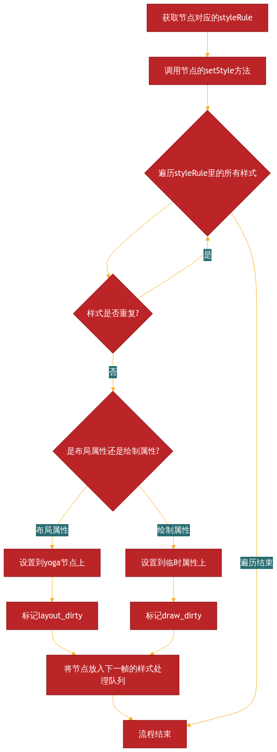 确定了节点对应的样式表后,我们就到了把样式应用到节点上这个环节了。这个环节我们会调用节点的 SetStyle 方法,遍历 StyleRule 中的所有样式。对于布局相关的属性(如 display、position、float、flex、width、height、margin、padding),如需更新,会被设置到节点对应的 Yoga 节点上,同时为节点本身添加 layout_dirty 标记。接着,判断是否有绘制相关的属性需要更新,如果有,则设置到节点对象的临时属性上,并为节点添加 draw_dirty 标记。这些被标记的节点并不会立刻被处理,而是会被纳入下一帧的样式处理队列中,这样能避免同一帧多次设置同一个结点的相同属性,确保样式更新的高效性,同时也能保证布局属性和绘制属性设置到鸿蒙节点时的前后时序。