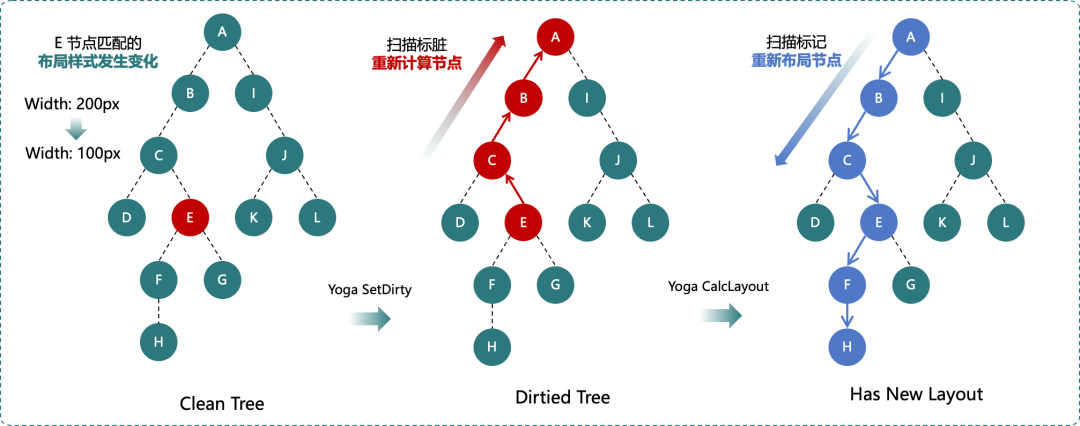 我们用一个例子来说明Yoga如何判断布局变化的影响范围:假设节点E的宽度改变,这可能影响到依赖父元素宽度的子元素以及由子元素撑开宽度的父元素。计算后,系统可能会更新A、B、C、E、F、H等节点。