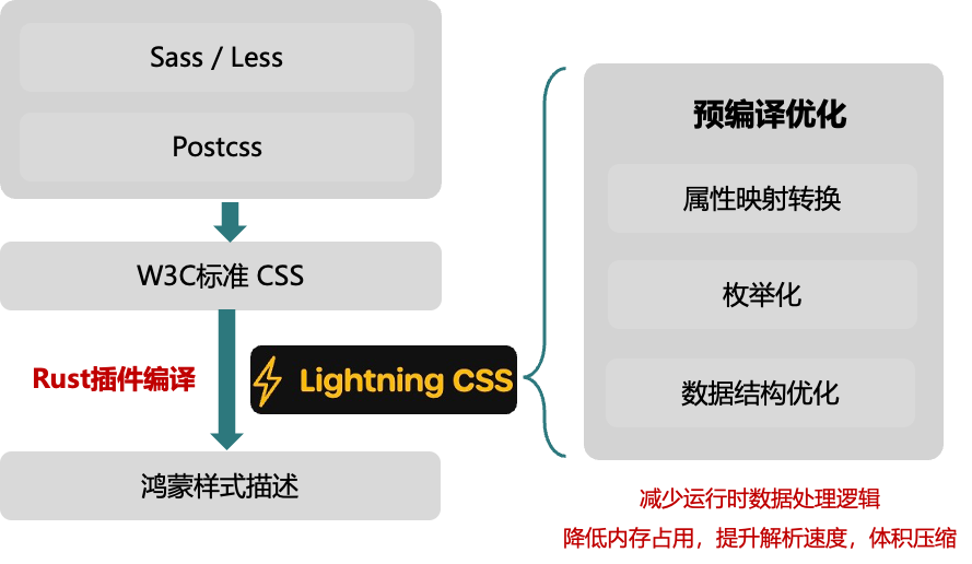 一个页面通常会包含非常多的样式规则,如果所有的单位转换都放在运行时候完成,必定会造成明显的性能问题。因此,我们选择提前完成部分转换。HTML 节点的样式主要来源于 CSS 和 Style 属性。CSS 样式通常是静态的,可以在编译阶段进行转换。为此,我们基于 lightningCSS 开发了一个 Rust 插件。该插件通过遍历项目 CSS 的抽象语法树(AST),将其转换为 ArkUI 的 CAPI 接口可直接使用的数据结构。