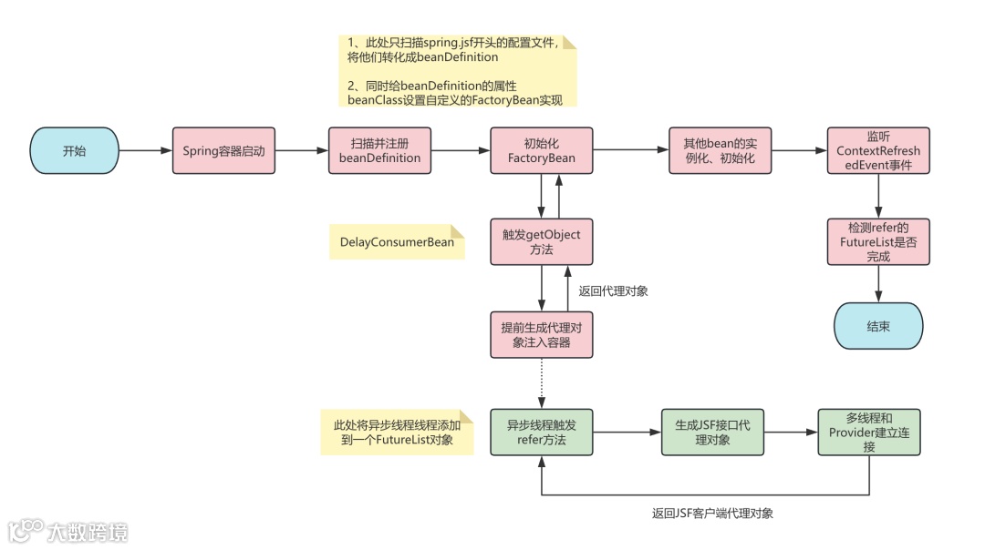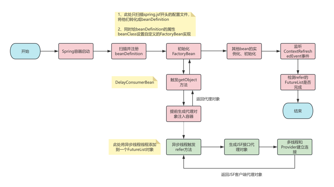 3、JsfConsumer客户端代理bean异步生成,此处主要核心在于使用一个自定义代理对象提前返回引用,这种思想我们也可以应用到其他需要异步初始化对象的地方去,具体可以参考3.2节的流程图。
