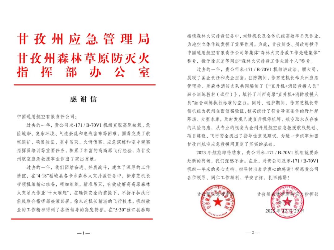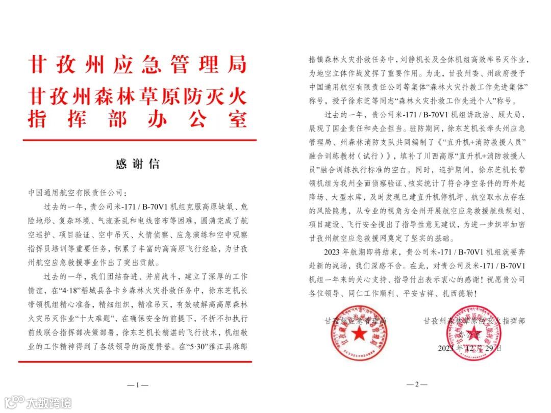 在2023年“4·18”四川甘孜州稻城县各卡乡森林火灾扑救任务中,徐东芝机组精心准备,精细组织,精准吊灭,洒水71桶、172吨。在2024年“6·07”藏东地区森林火灾扑救任务中,徐东芝机组对高山悬崖火连续实施精准高效的吊桶灭火,洒水242桶、484吨。中国通航机组以过硬的技术、扎实的作风、敬业的精神,获得川藏两地政府和应急部门的高度赞誉。