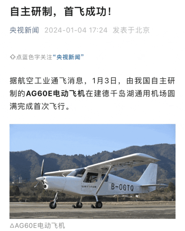 2024年1月3日,在距离建德自在堂生态农场仅10分钟车程的建德千岛湖通用机场,由我国自主研制的AG60E电动飞机圆满完成首次飞行。