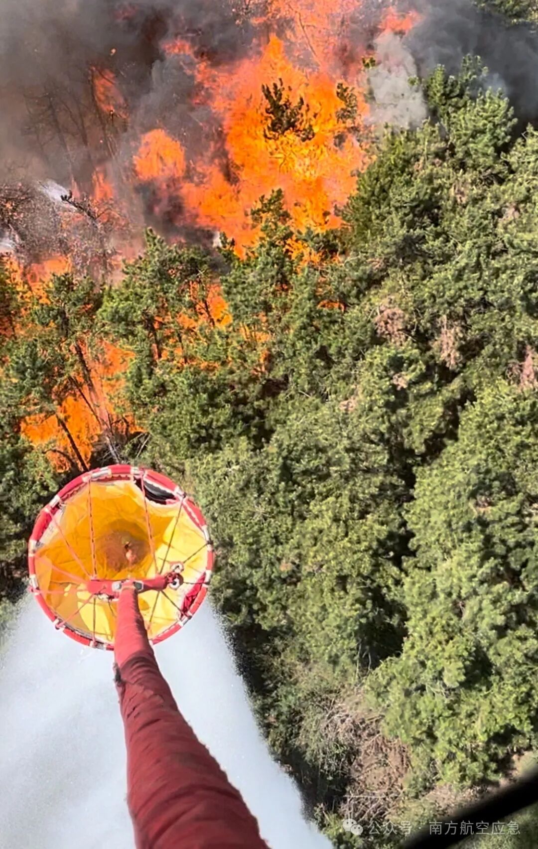 此次火场干旱、高温、大风特点明显,林下可燃物载量大,林火复燃机率高,火点烟点频发,加之山高谷深、沟壑纵横、地形破碎,尤其山谷内高压线密布,直升机灭火作业难度极大。在火场指挥部的科学指挥下,航空救援队伍密切配合,攻火头、打险段、灭烟点,连续奋战7个昼夜,累计飞行13架次14小时35分,洒水31桶93吨,空投灭火水弹4枚2吨;扑灭复燃火线500余米、处置火点烟点20余处、悬崖火3处,飞火1处;向火场指挥部提供火场照片、视频、扑救建议20余份,为扑灭林火贡献了航空应急救援力量。