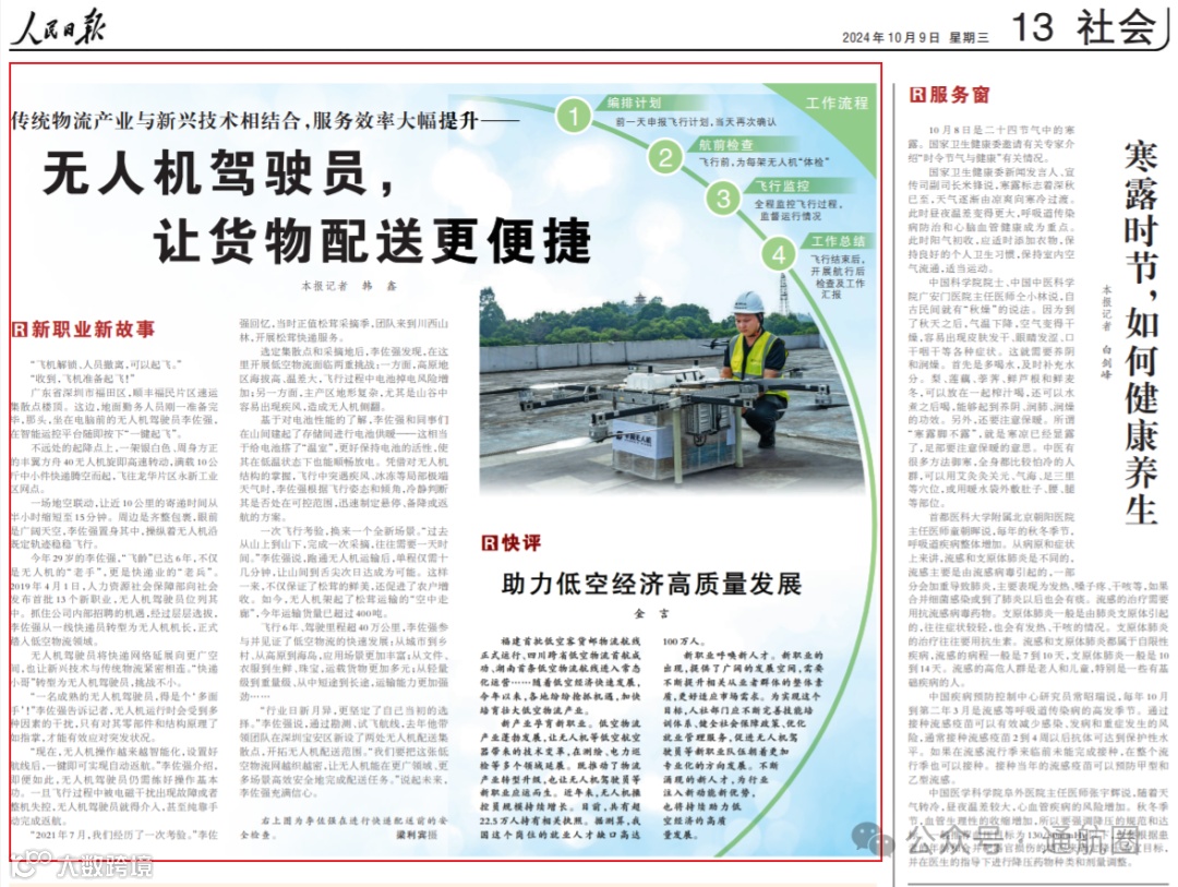 10月9日,《人民日报》发文对低空物流领域无人机驾驶员这一新职业进行了报道,同时发布评论指出:福建首批低空客货邮物流航线正式运行、四川跨省低空物流首航成功、湖南首条低空物流航线进入常态化运营……随着低空经济快速发展,今年以来,各地纷纷抢抓机遇,加快培育壮大低空物流产业。低空物流产业蓬勃发展,让无人机等低空航空器带来的技术变革,在测绘、电力巡检等多个领域延展。既推动了物流产业转型升级,也让无人机驾驶员等新职业应运而生。近年来,无人机操控员规模持续增长。目前,共有超22.5万人持有相关执照。据测算,我国这个岗位的就业人才缺口高达100万人。评论同时指出,新职业的出现,提供了广阔的发展空间,需要不断提升相关从业者群体的整体素质,更好适应市场需求。为实现这个目标,人社部门应不断完善技能培训体系、健全社会保障政策、优化就业管理服务,促进无人机驾驶员等新职业队伍朝着更加专业化的方向发展。
