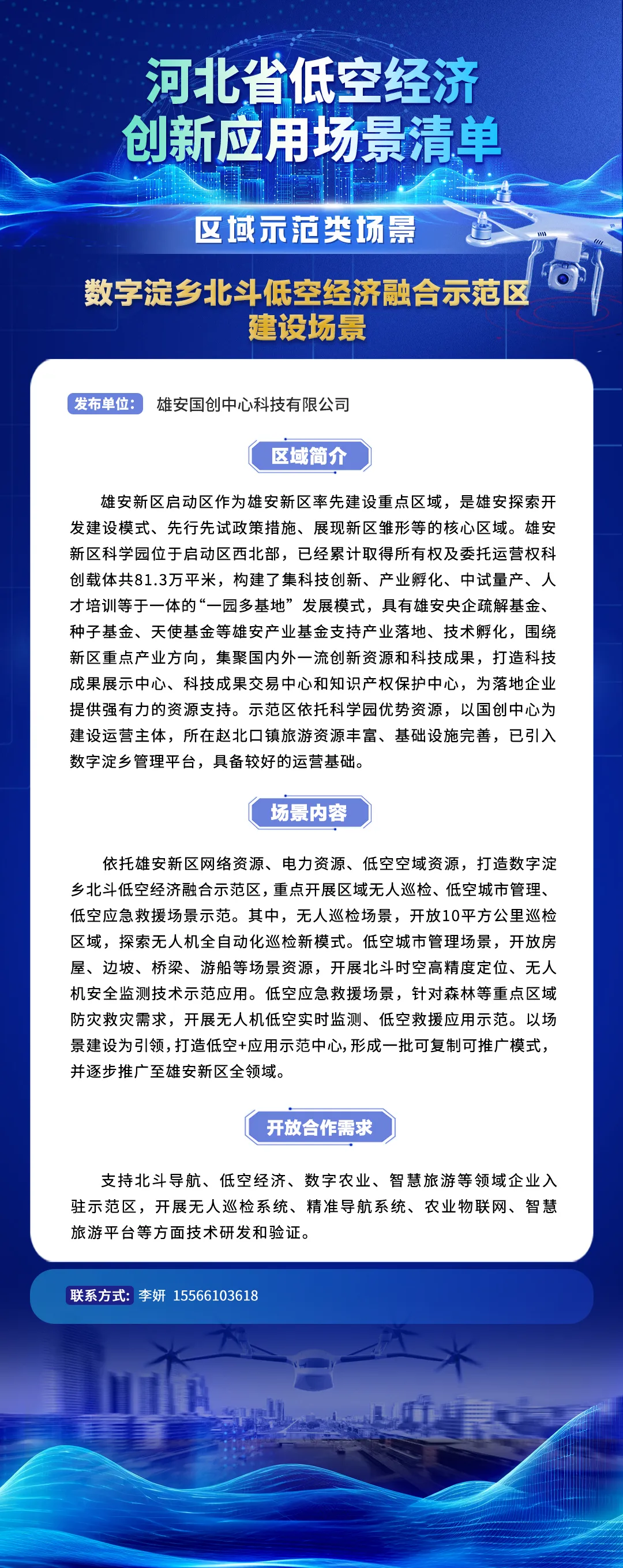 依托雄安新区网络资源、电力资源、低空空域资源,打造数字淀乡北斗低空经济融合示范区,重点开展区域无人巡检、低空城市管理、低空应急救援场景示范。其中,无人巡检场景,开放10平方公里巡检区域,探索无人机全自动化巡检新模式。低空城市管理场景,开放房屋、边坡、桥梁、游船等场景资源,开展北斗时空高精度定位、无人机安全监测技术示范应用。低空应急救援场景,针对森林等重点区域防灾救灾需求,开展无人机低空实时监测、低空救援应用示范。以场景建设为引领,打造低空+应用示范中心,形成一批可复制可推广模式,并逐步推广至雄安新区全领域。