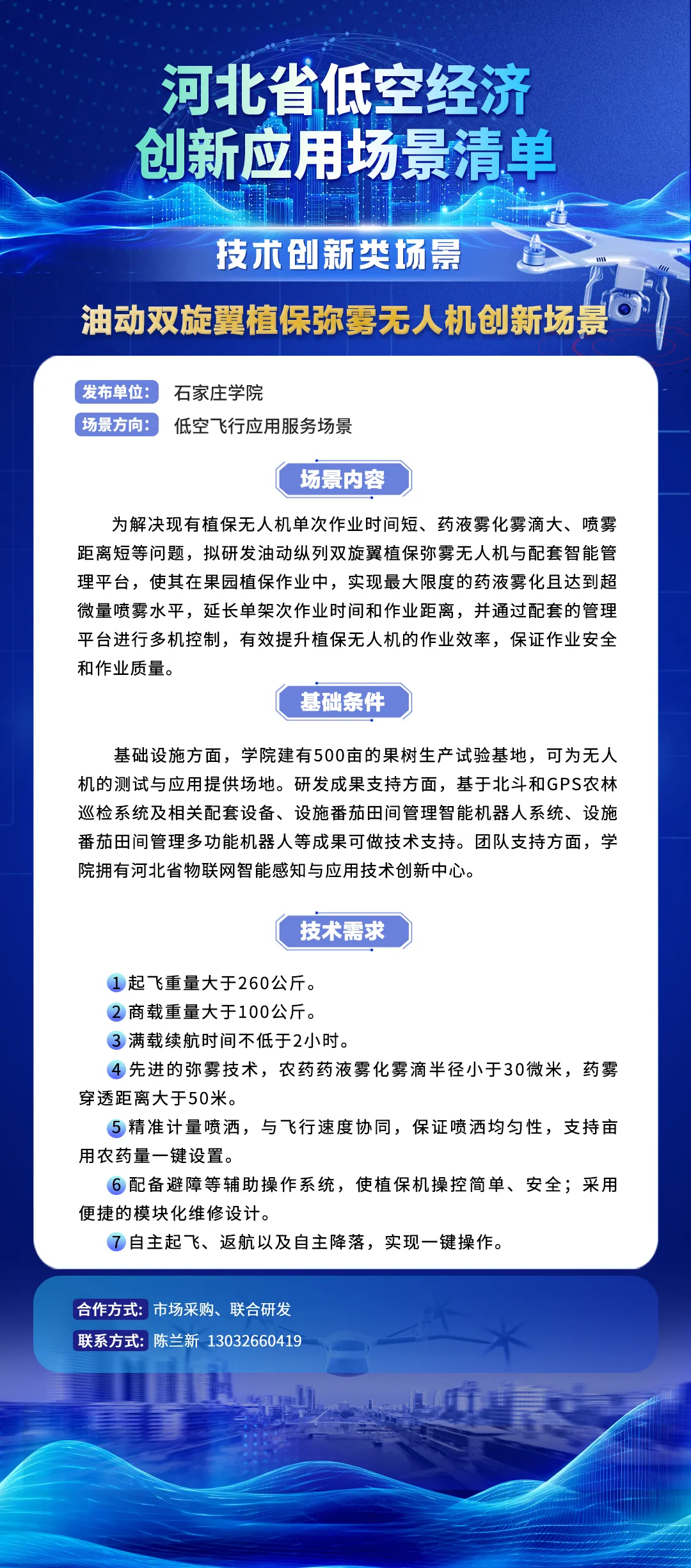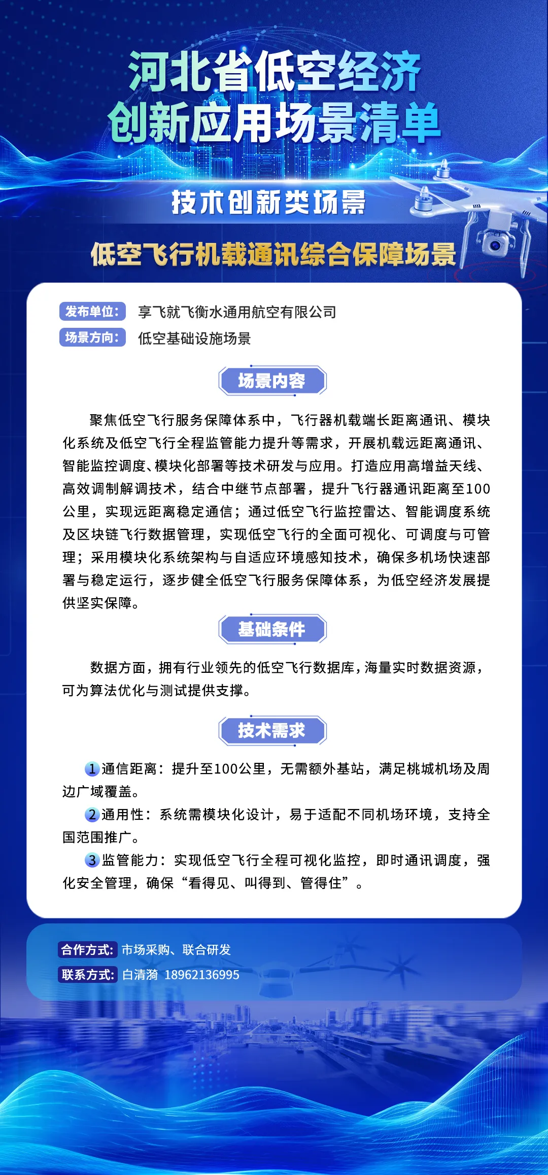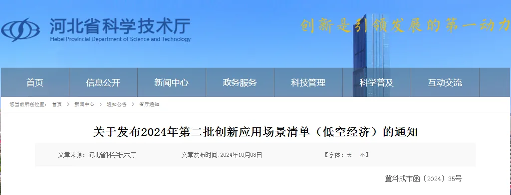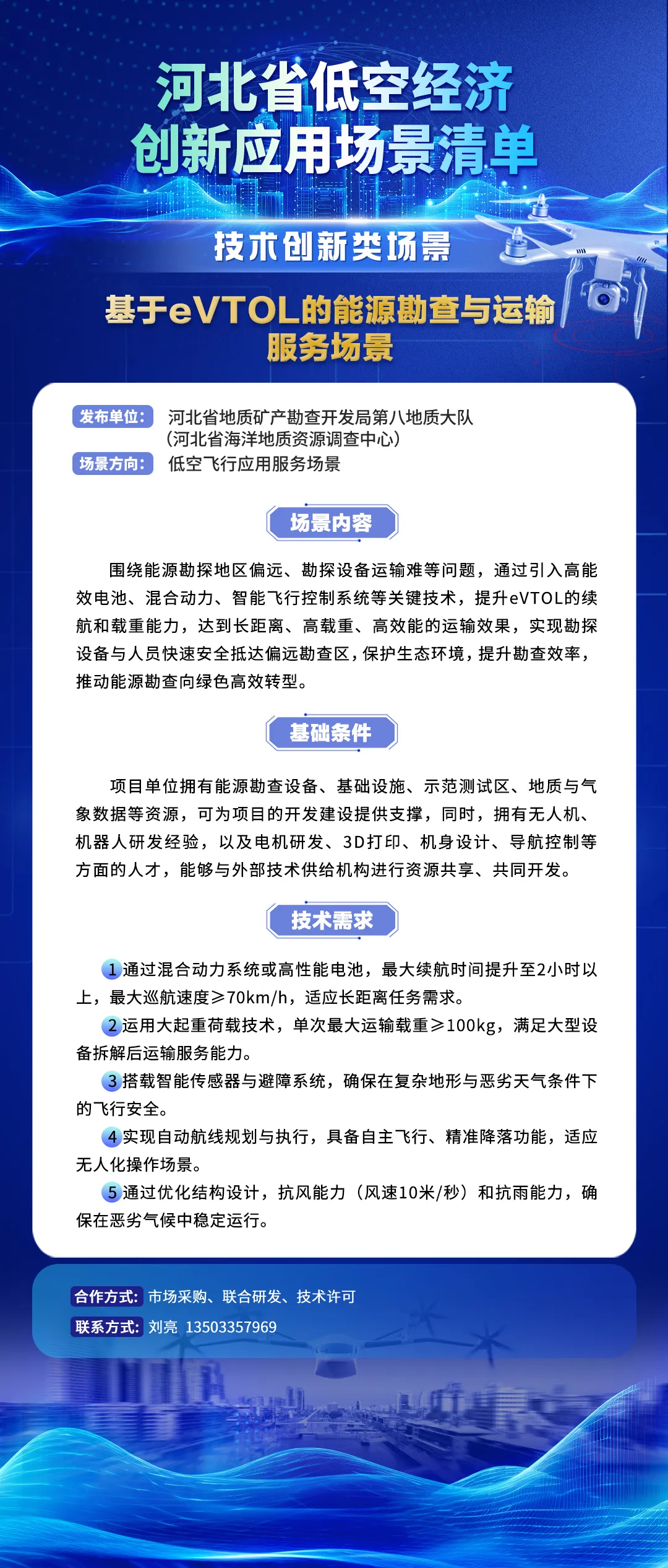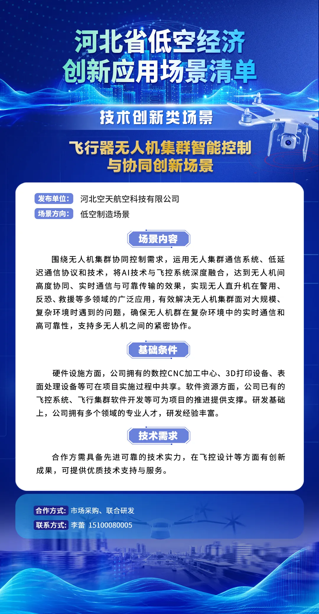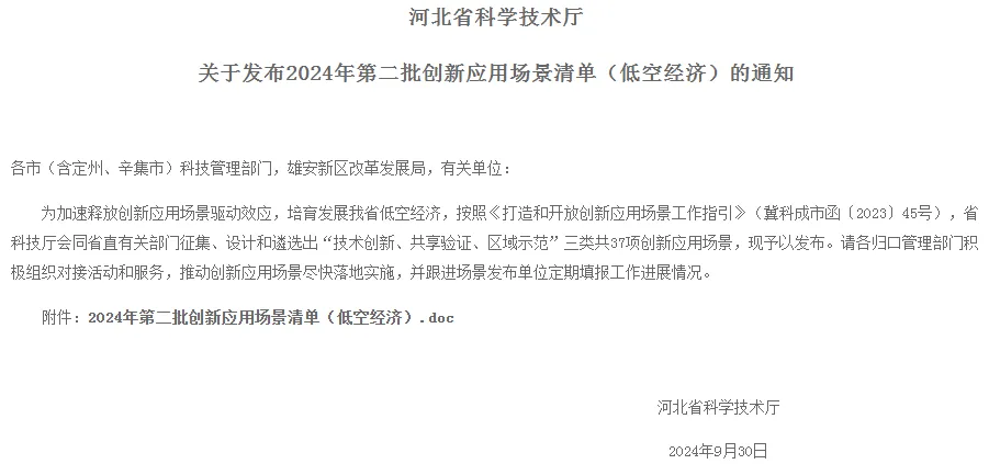 为加速释放创新应用场景驱动效应,培育发展我省低空经济,按照《打造和开放创新应用场景工作指引》(冀科成市函〔2023〕45号),省科技厅会同省直有关部门征集、设计和遴选出“技术创新、共享验证、区域示范”三类共37项创新应用场景,现予以发布。请各归口管理部门积极组织对接活动和服务,推动创新应用场景尽快落地实施,并跟进场景发布单位定期填报工作进展情况。