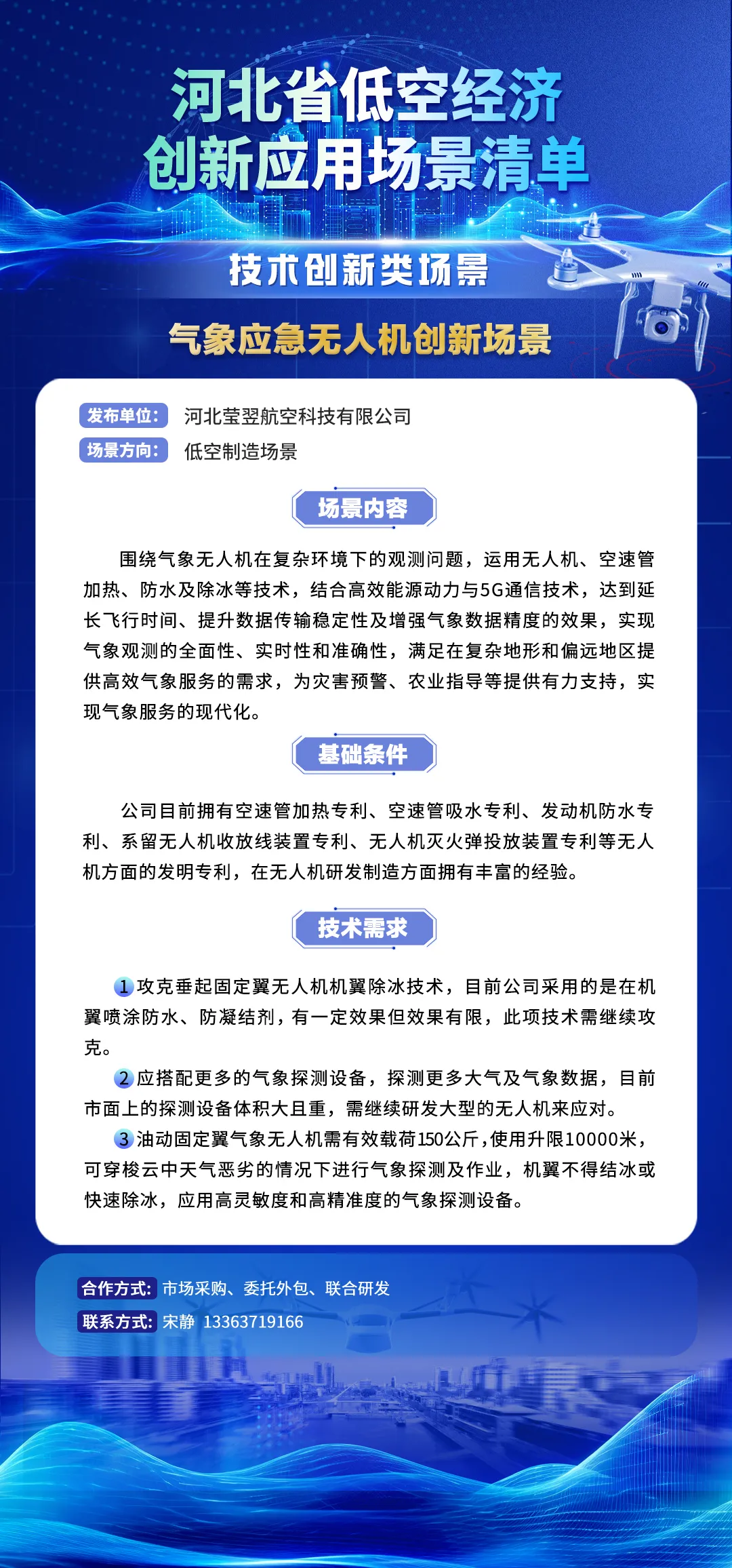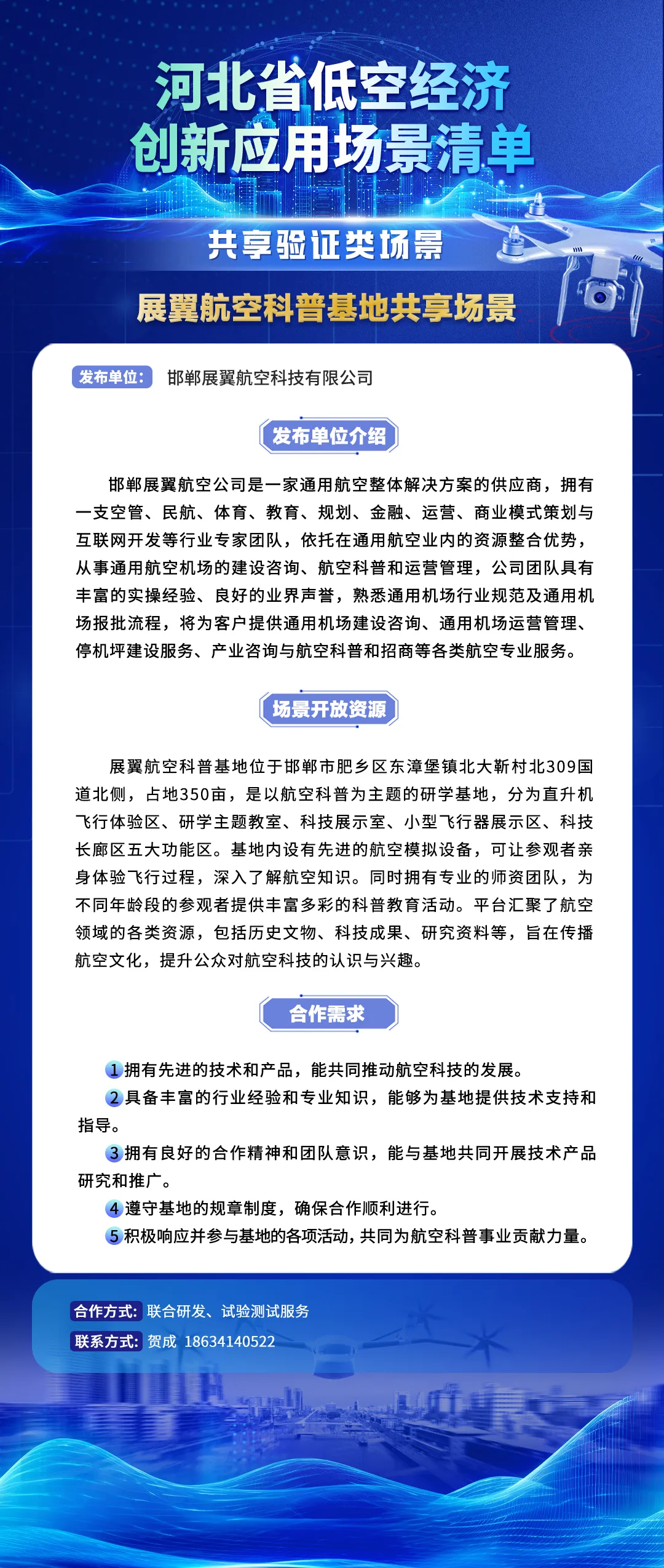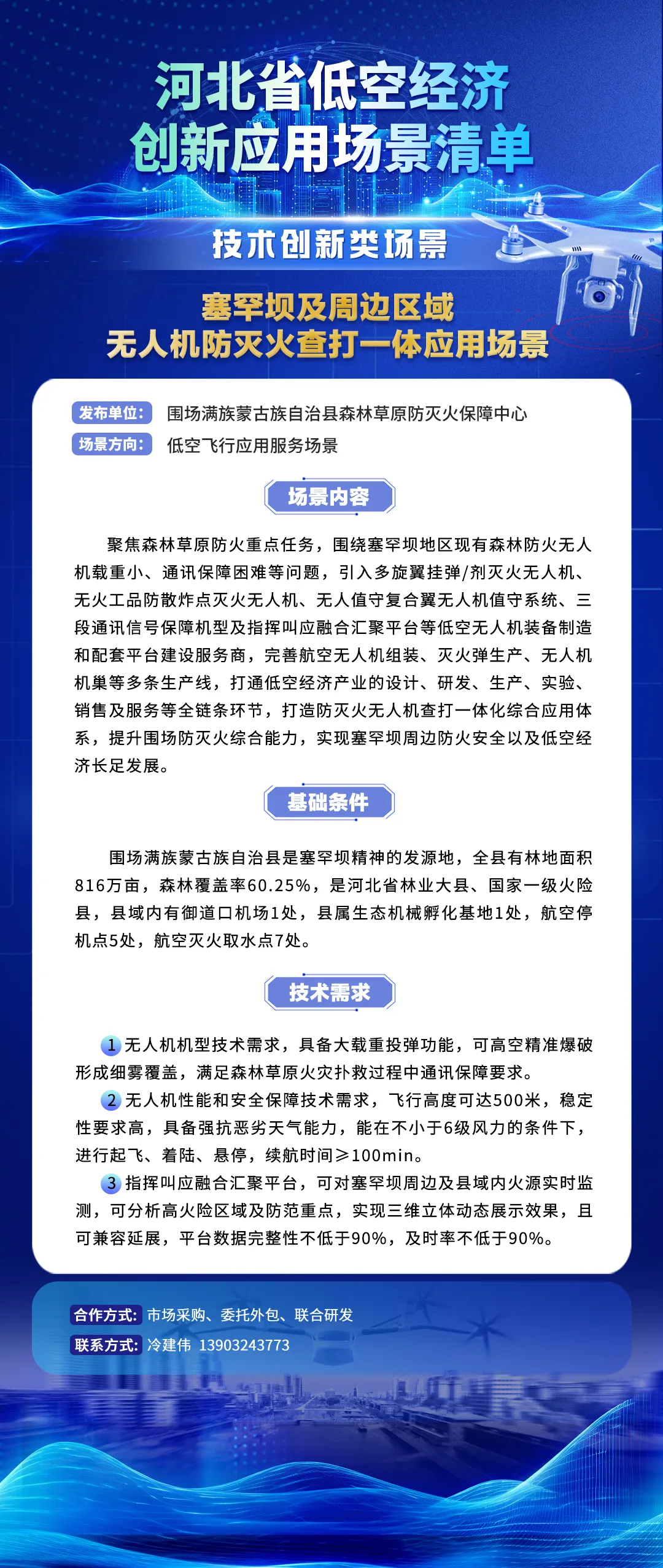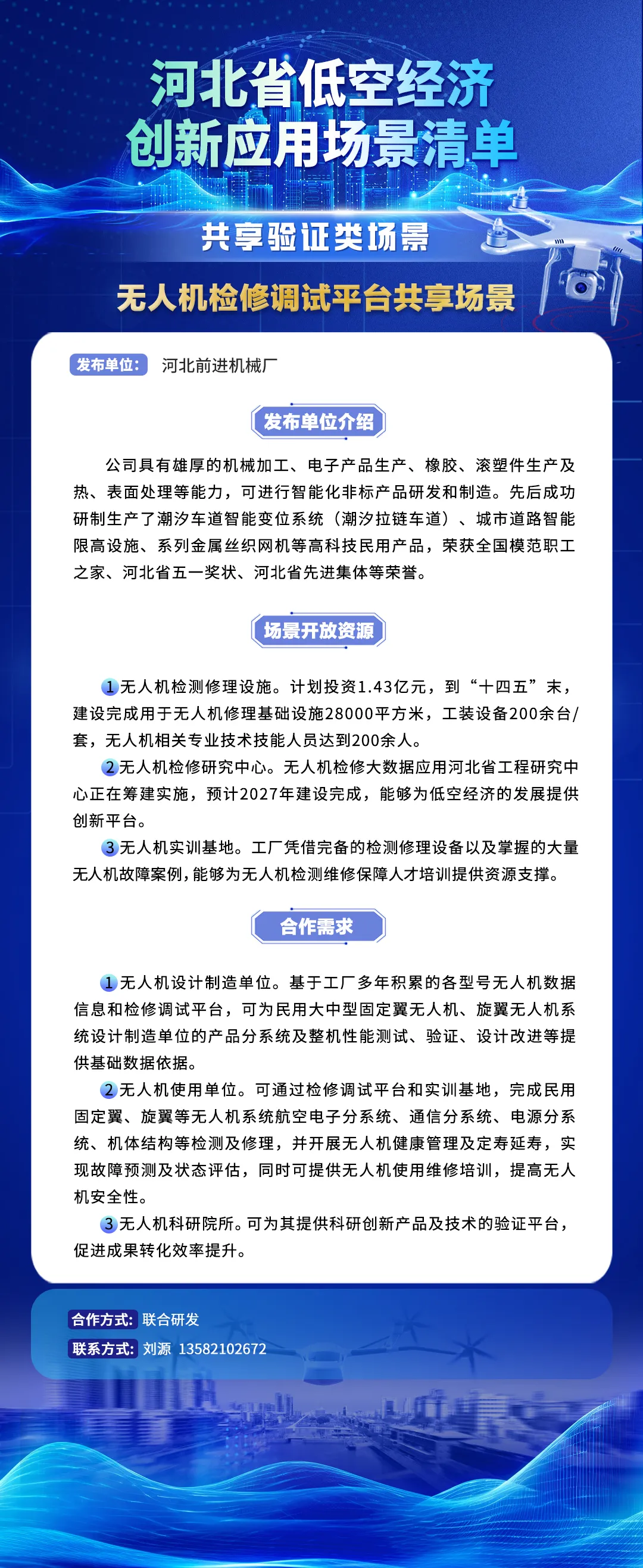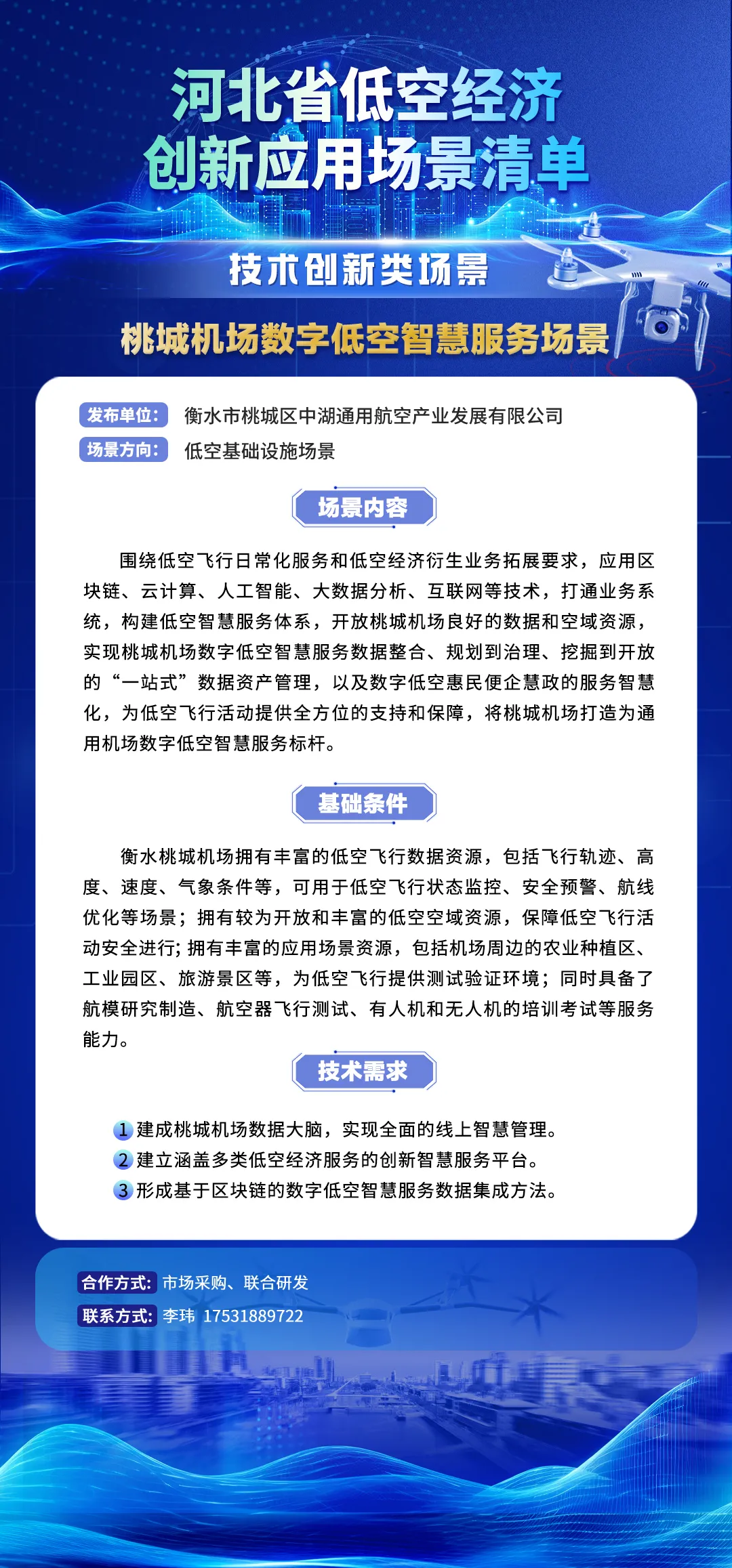 为加速释放创新应用场景驱动效应,培育发展我省低空经济,按照《打造和开放创新应用场景工作指引》(冀科成市函〔2023〕45号),省科技厅会同省直有关部门征集、设计和遴选出“技术创新、共享验证、区域示范”三类共37项创新应用场景,现予以发布。请各归口管理部门积极组织对接活动和服务,推动创新应用场景尽快落地实施,并跟进场景发布单位定期填报工作进展情况。
