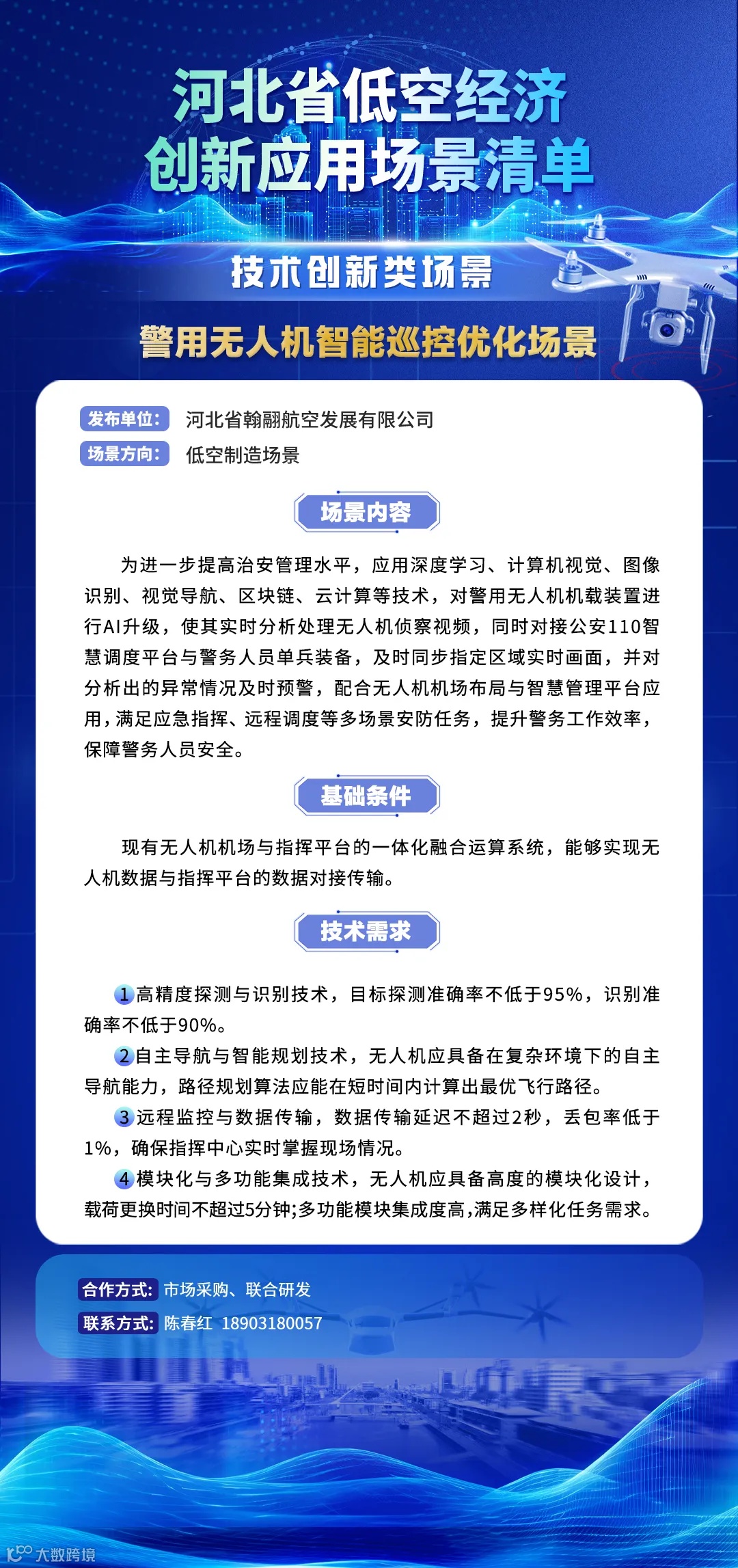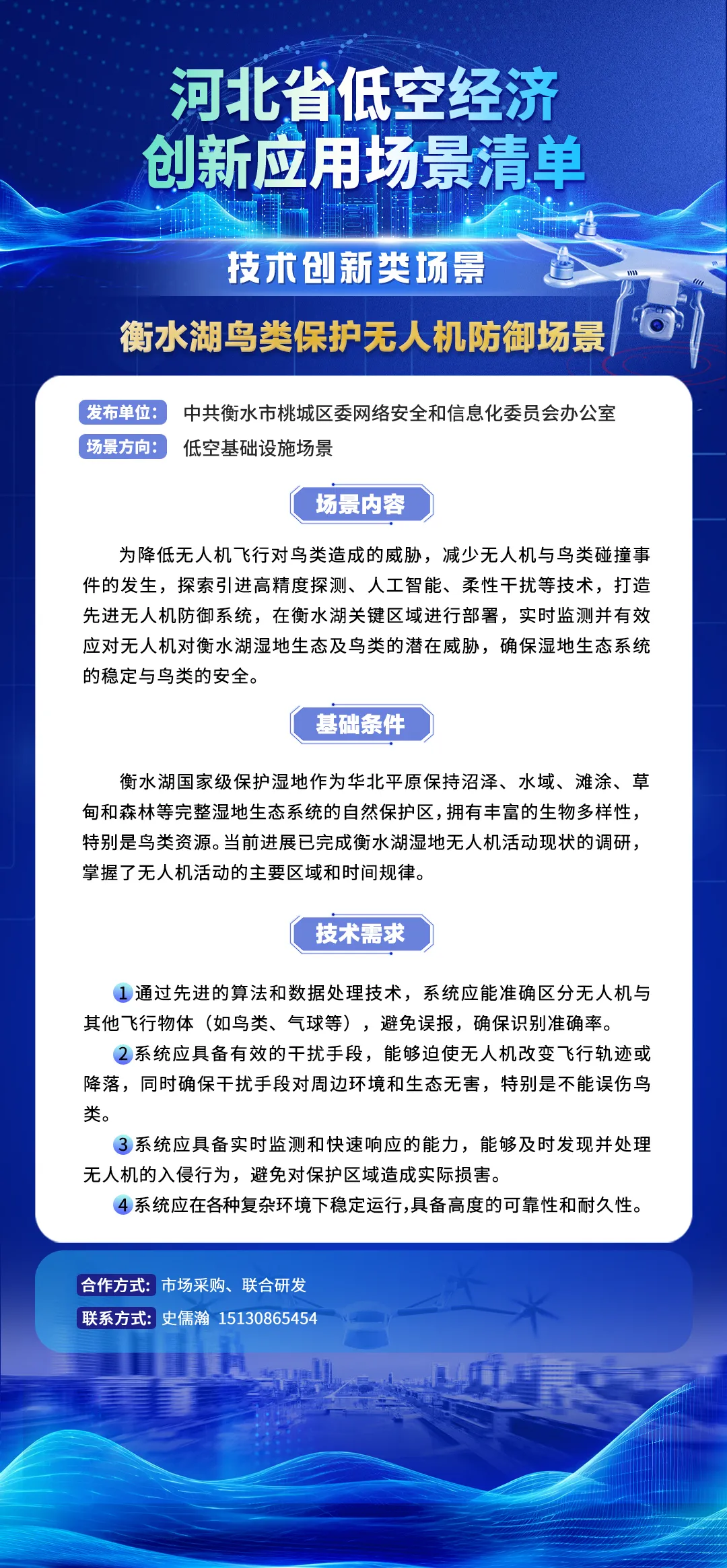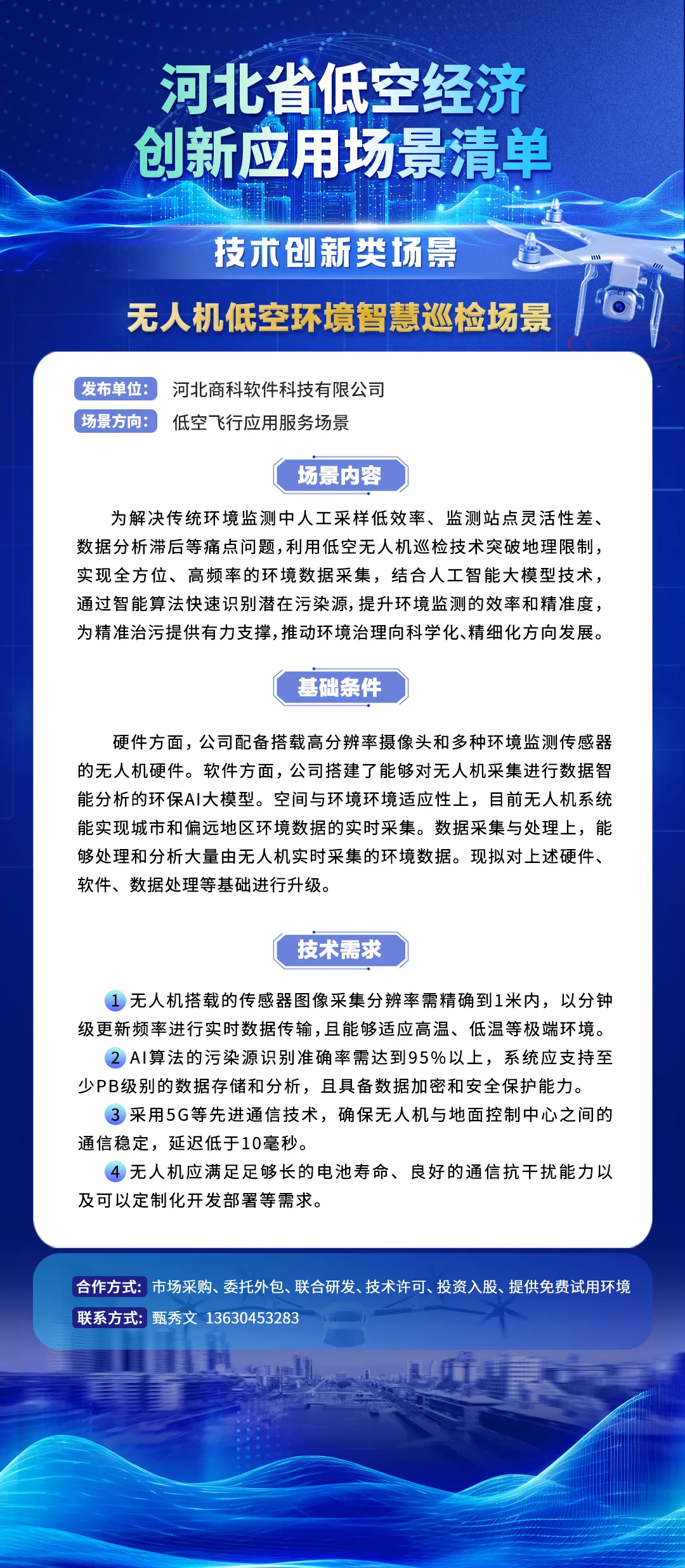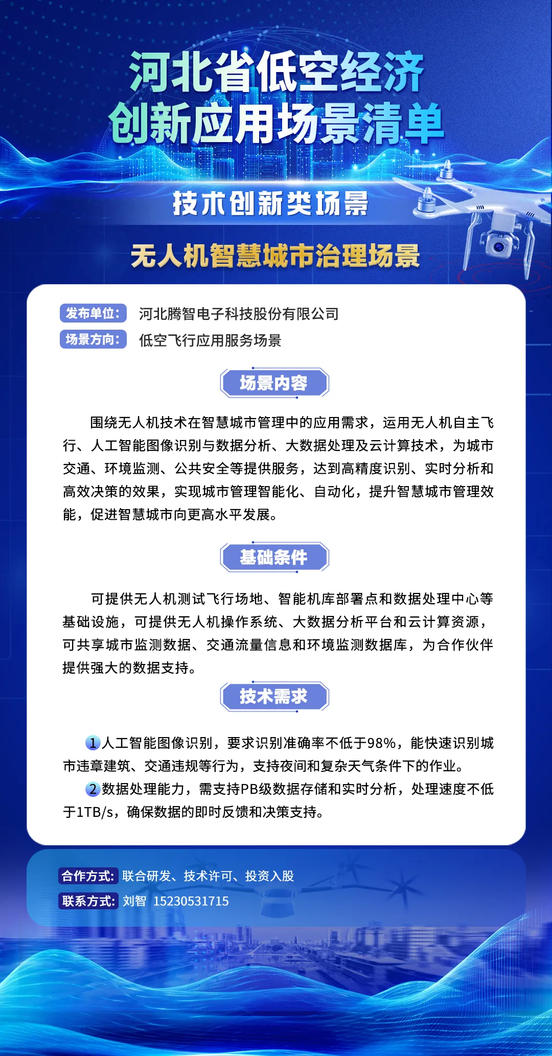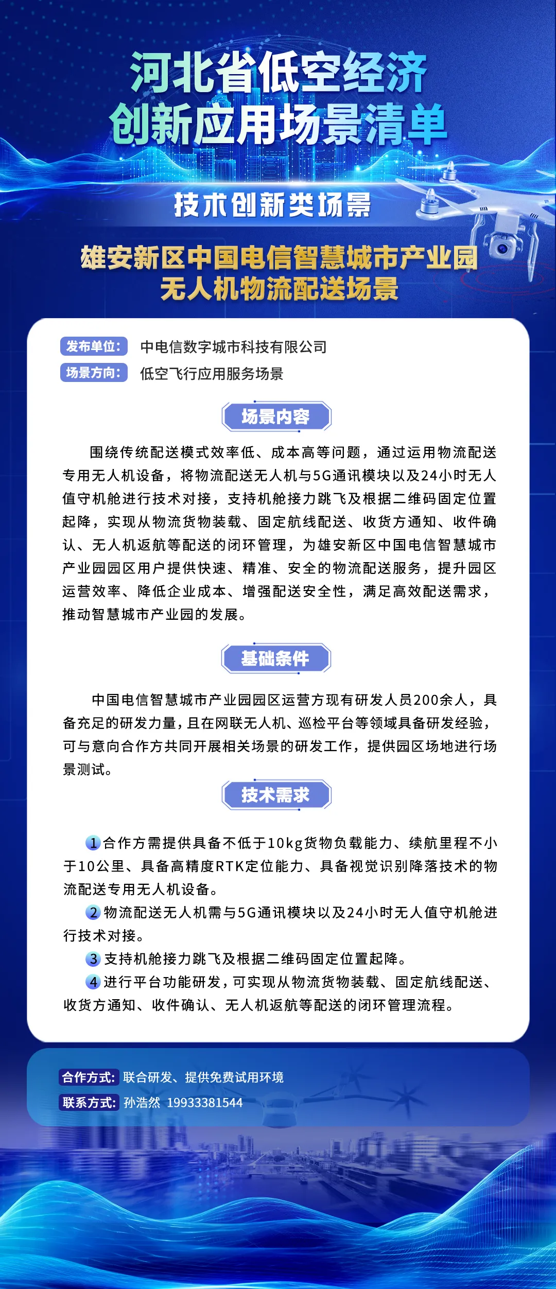 为加速释放创新应用场景驱动效应,培育发展我省低空经济,按照《打造和开放创新应用场景工作指引》(冀科成市函〔2023〕45号),省科技厅会同省直有关部门征集、设计和遴选出“技术创新、共享验证、区域示范”三类共37项创新应用场景,现予以发布。请各归口管理部门积极组织对接活动和服务,推动创新应用场景尽快落地实施,并跟进场景发布单位定期填报工作进展情况。