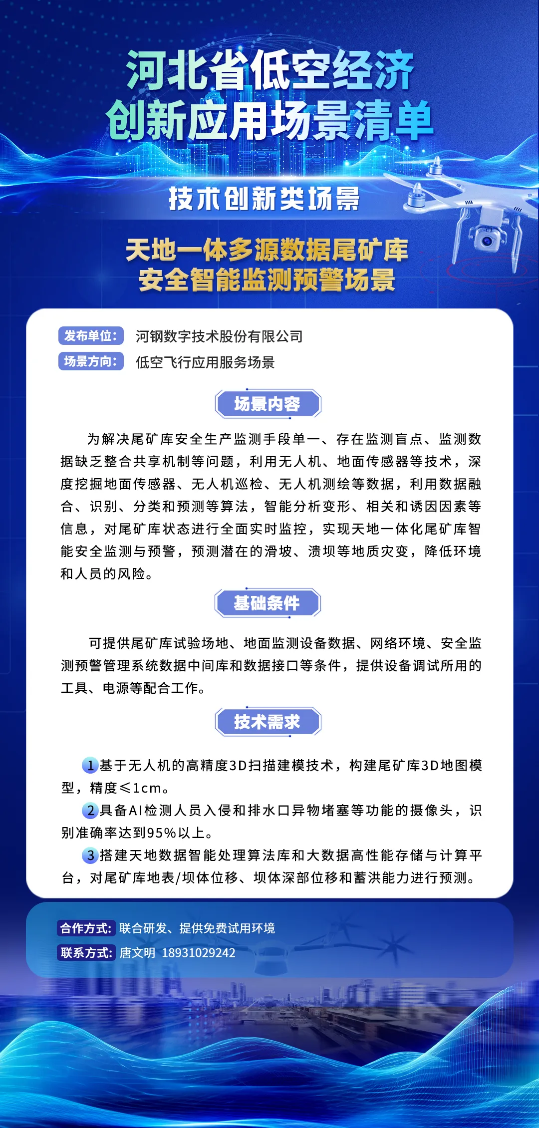 为解决尾矿库安全生产监测手段单一、存在监测盲点、监测数据缺乏整合共享机制等问题,利用无人机、地面传感器等技术,深度挖掘地面传感器、无人机巡检、无人机测绘等数据,利用数据融合、识别、分类和预测等算法,智能分析变形、相关和诱因因素等信息,对尾矿库状态进行全面实时监控,实现天地一体化尾矿库智能安全监测与预警,预测潜在的滑坡、溃坝等地质灾变,降低环境和人员的风险。