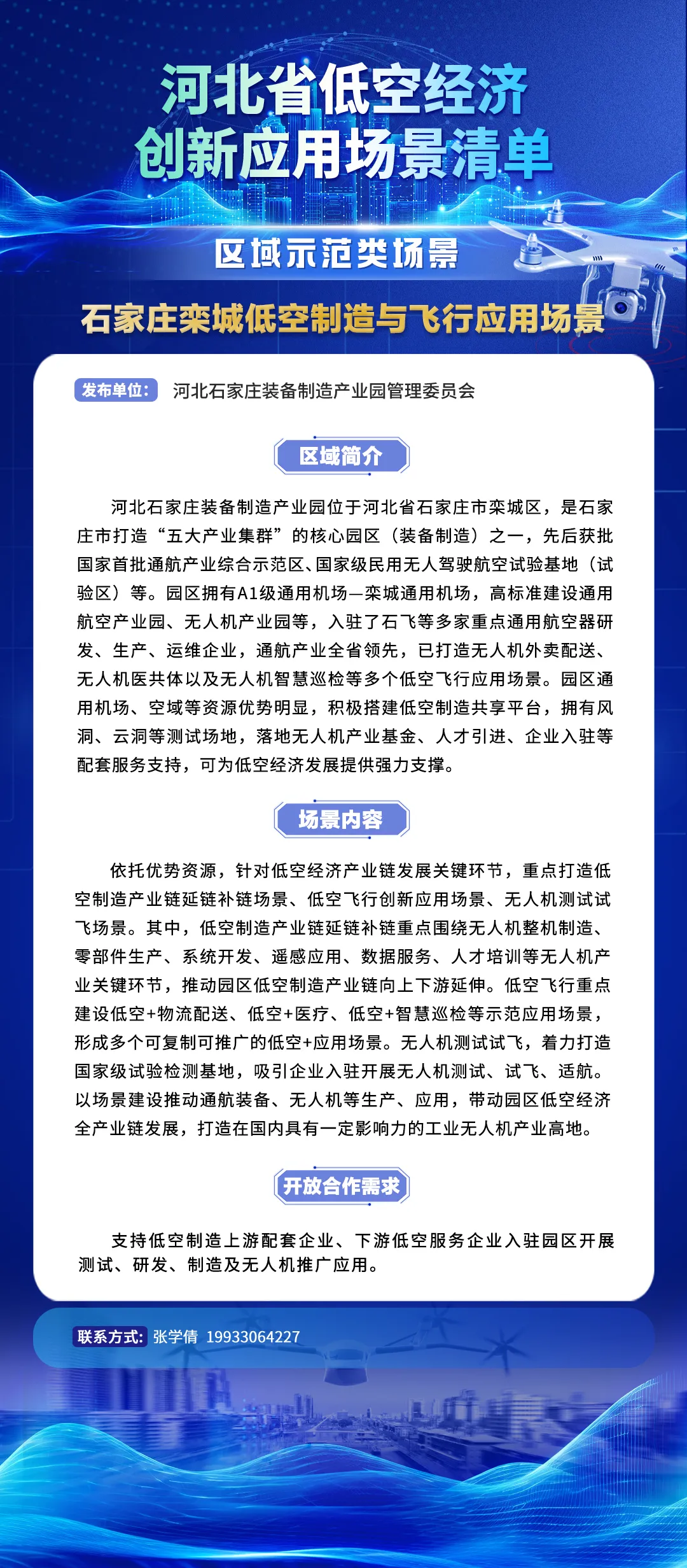 河北石家庄装备制造产业园位于河北省石家庄市栾城区,是石家庄市打造“五大产业集群”的核心园区(装备制造)之一,先后获批国家首批通航产业综合示范区、国家级民用无人驾驶航空试验基地(试验区)等。园区拥有A1级通用机场—栾城通用机场,高标准建设通用航空产业园、无人机产业园等,入驻了石飞等多家重点通用航空器研发、生产、运维企业,通航产业全省领先,已打造无人机外卖配送、无人机医共体以及无人机智慧巡检等多个低空飞行应用场景。园区通用机场、空域等资源优势明显,积极搭建低空制造共享平台,拥有风洞、云洞等测试场地,落地无人机产业基金、人才引进、企业入驻等配套服务支持,可为低空经济发展提供强力支撑。
