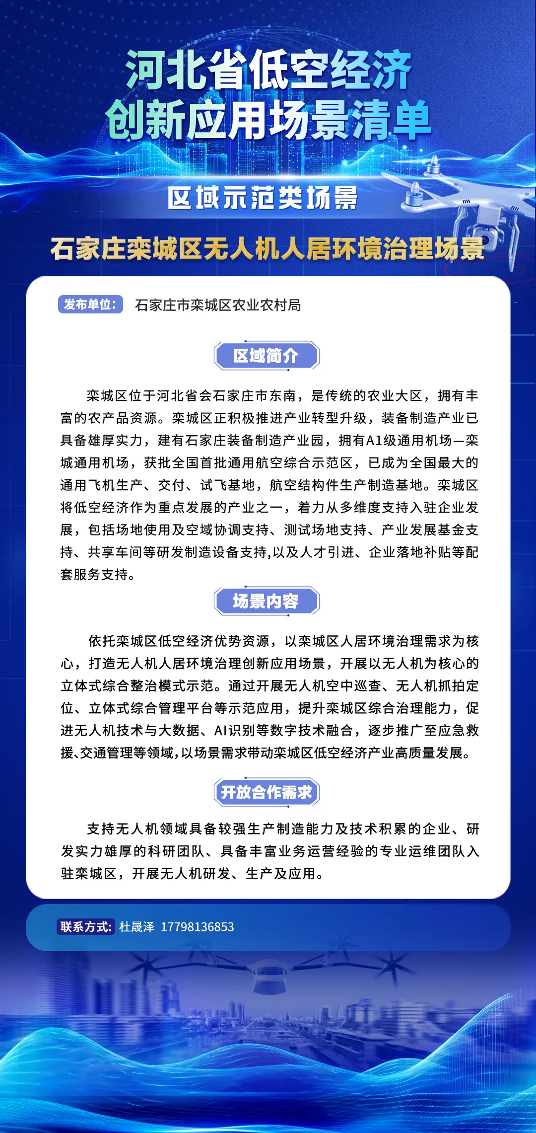 依托栾城区低空经济优势资源,以栾城区人居环境治理需求为核心,打造无人机人居环境治理创新应用场景,开展以无人机为核心的立体式综合整治模式示范。通过开展无人机空中巡查、无人机抓拍定位、立体式综合管理平台等示范应用,提升栾城区综合治理能力,促进无人机技术与大数据、AI识别等数字技术融合,逐步推广至应急救援、交通管理等领域,以场景需求带动栾城区低空经济产业高质量发展。