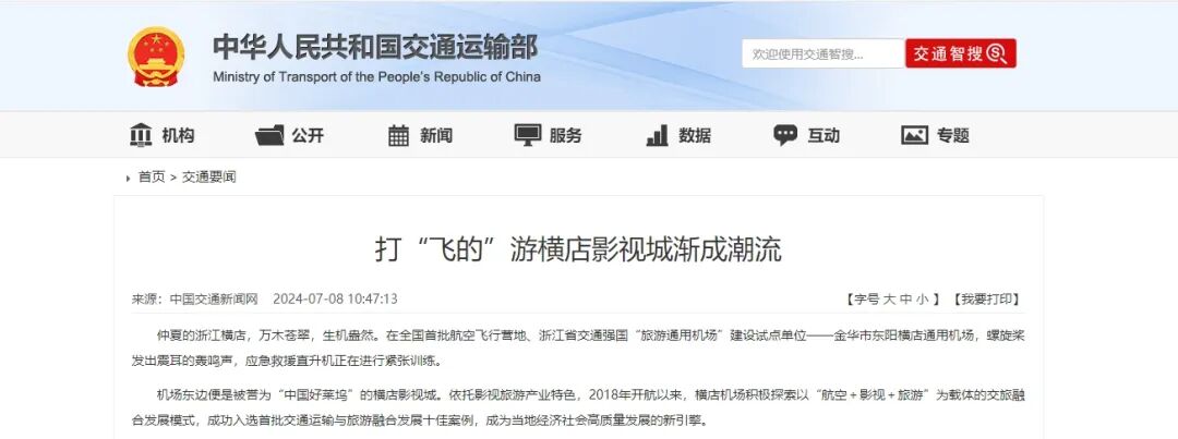 近日,交通运输部在官网发布《打“飞的”游横店影视城渐成潮流》一文,就横店以“航空+影视+旅游”为载体的交旅融合发展模式给予认可。