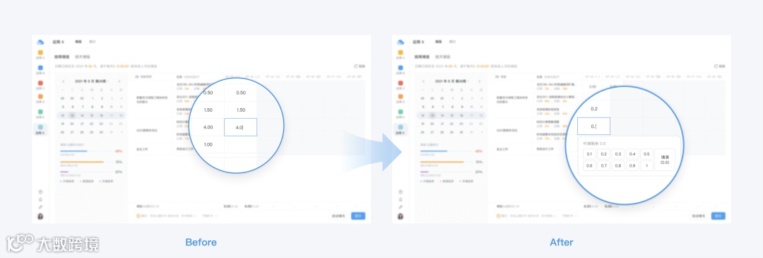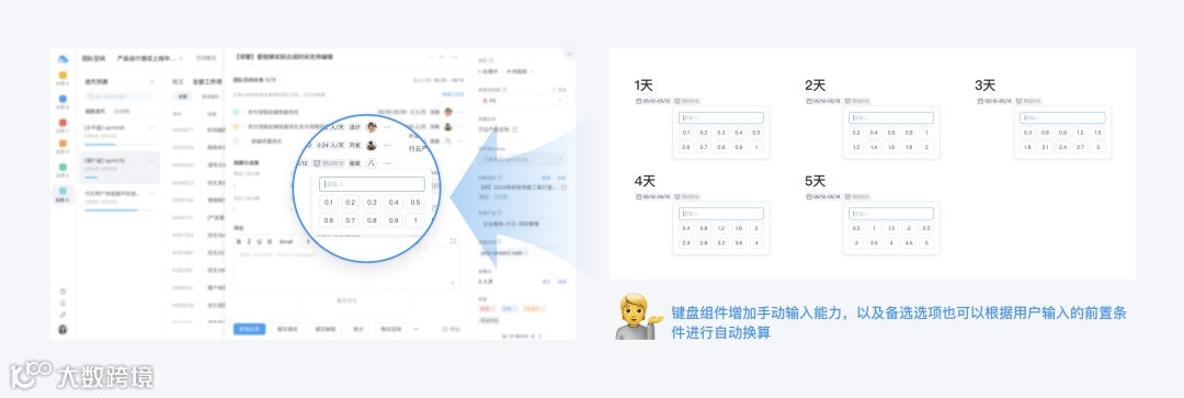 相信很多产品设计人员都清楚选择录入的优势远大于手动录入。在此之前,我们的工时填报页面,由于可输入信息精确到小数点后两位,所以我们常用的计步器、选择器、滑动输入等组件都无法在这里使用。对用户而言,手动逐项录入数据的操作成本非常高。在业务改版时,我们的体验设计师了解到旧版页面信息录入成本过高的问题,于是提出了数字键盘录入数据的方案「用户在原本手动录入数据的基础上,增加选择录入数据的能力,以此降低用户录入数据的操作负担」。