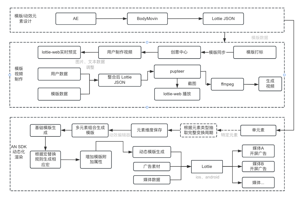 我们都知道,视频相比较图片能传达更多的有效信息,更能吸引注意力,那在广告业务中也是同理的。这里我就主要介绍下在广告视频广告业务的经历,主要有两段经历,第一段经历是在短视频蓬勃发展的时期,为了赶上这种变化,我们积极主动地进行技术探索,致力于寻找一种能够帮助用户快速创建视频创意的方案。经过我们的不断尝试,最终确认通过使用“AE+Lottie”方案实现模版的制作和播放,使用“pupteer+ffmpge”生成最终的视频文件。这个方案在当时的电商广告行业也是一种创新,通过我们方案,能有效的为广告主提供了视频创意制作的途径。我很荣幸能参与到这个项目,同我们前端团队的架构师,以及后端、算法团队共同来完成这件事情。这次项目经历不仅提升了我的专业技能,也进一步开阔了我的视野,也为我后续的发展做了良好的铺垫。