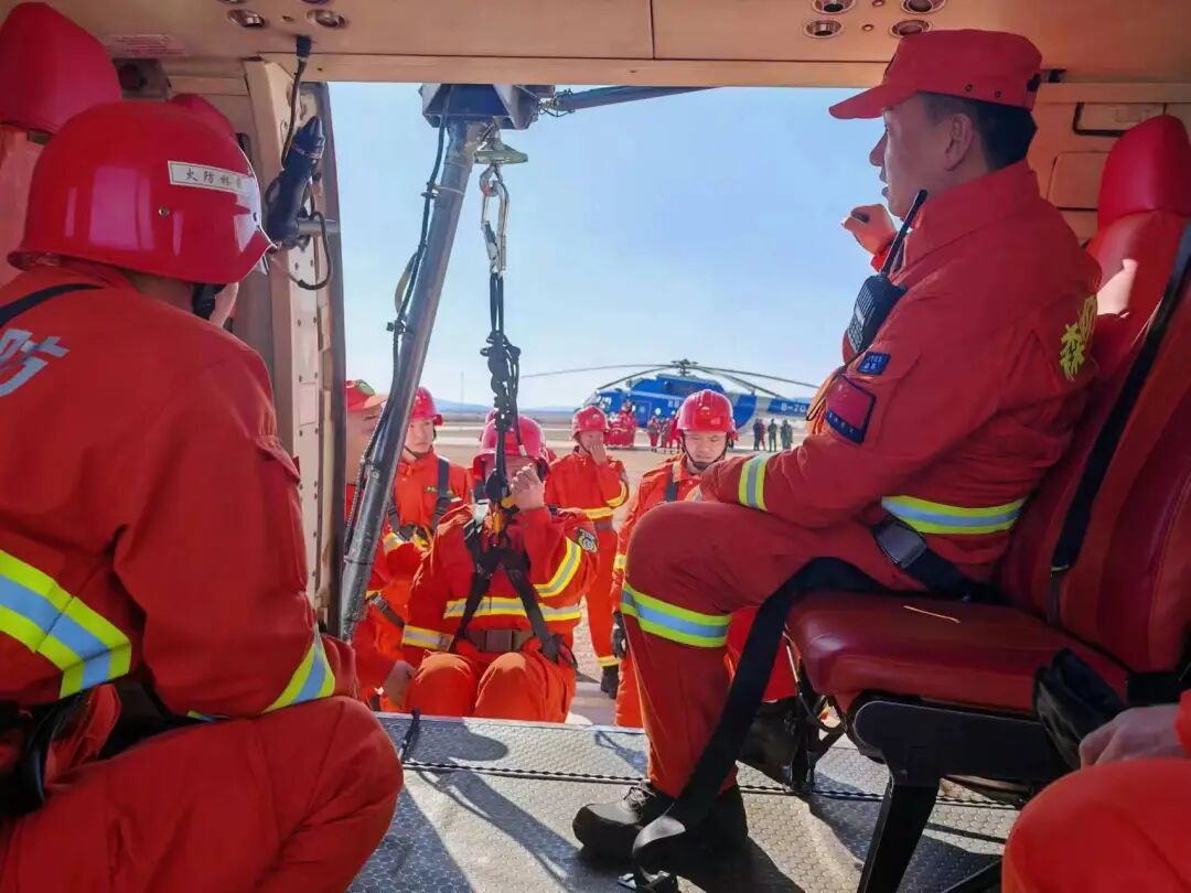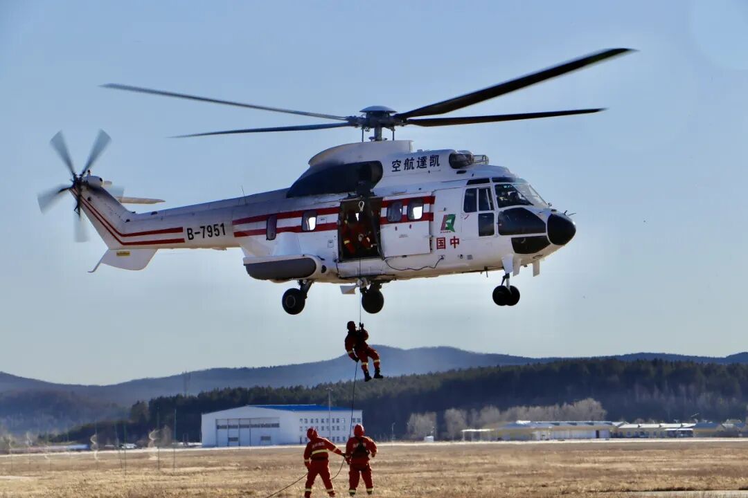 在近日的直升机索降训练中,凯达通航B-7951机组配合林业集团公司一支队进行了为期3天的索降专项训练,队员们身着防火服,佩戴齐全的安全装备,模拟在森林火灾中利用直升机进行快速索降。
