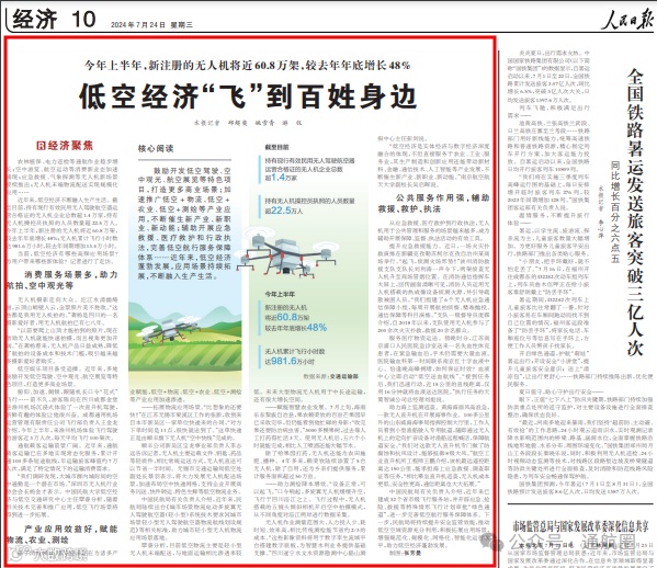 7月24日,《人民日报》刊发文章《低空经济“飞”到百姓身边(经济聚焦)》介绍,鼓励开发低空驾驶、空中观光、航空展览等特色项目,打造更多商业场景;加速推广低空+物流、低空+农业、低空+测绘等产业应用,不断催生新产业、新职业、新动能;辅助开展应急救援、医疗救护和行政执法,完善低空航行服务保障体系……近年来,低空经济蓬勃发展,应用场景持续拓展,不断融入生产生活。文章介绍,截至目前,持有现行有效民用无人驾驶航空器运营合格证的无人机企业总数超1.4万家,持有无人机操控员执照的人员数量超22.5万人。今年上半年,新注册的无人机将近60.8万架,较去年年底增长48%;无人机累计飞行小时数达981.6万小时,较去年同期增加13.4万小时。文章还介绍,通航载客运输前景广阔。近年来,通航载客运输已在多地实现常态化服务,累计开通100多条短途航线,年运输旅客峰值约7万人次,满足了特定情况下的运输消费需求。
