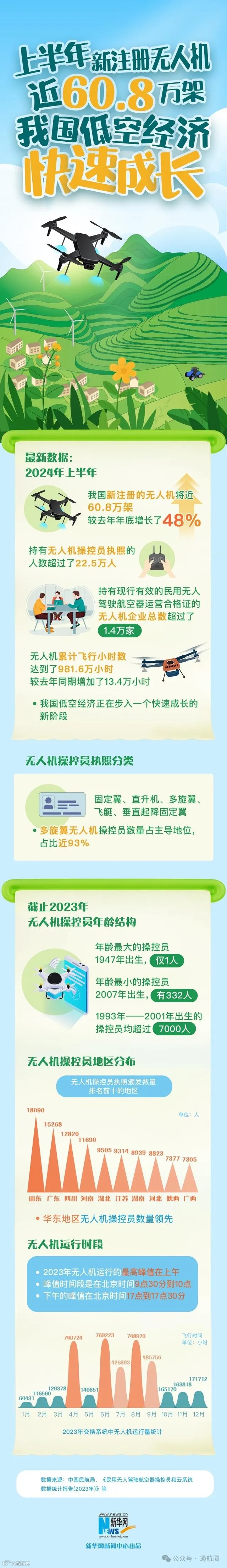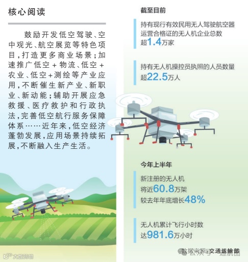 近年来,低空经济不断融入生产生活。截至目前,持有现行有效民用无人驾驶航空器运营合格证的无人机企业总数超1.4万家,持有无人机操控员执照的人员数量超22.5万人。今年上半年,新注册的无人机将近60.8万架,较去年年底增长48%;无人机累计飞行小时数达981.6万小时,较去年同期增加13.4万小时。