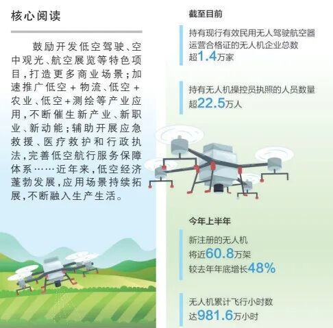 近年来,低空经济不断融入生产生活。截至目前,持有现行有效民用无人驾驶航空器运营合格证的无人机企业总数超1.4万家,持有无人机操控员执照的人员数量超22.5万人。今年上半年,新注册的无人机将近60.8万架,较去年年底增长48%;无人机累计飞行小时数达981.6万小时,较去年同期增加13.4万小时。