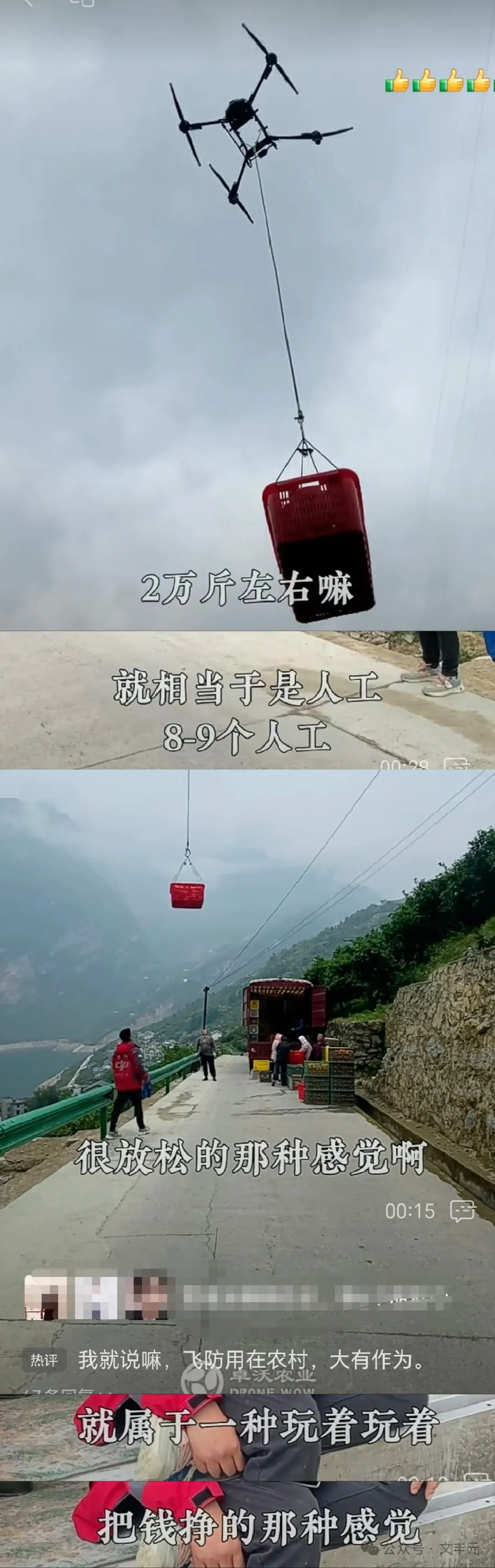 我国由于大规模城镇化的发展,平原土地大幅减少,很多农作物纷纷上梯田,进入山区。农业上梯田进入山区后,面临的最大挑战是,农业作业不可能再简单地依赖拖拉机等传统农业机械,尤其是农作物收获后的物流运输更困难,应用了无人机,这些问题就迎刃而解!既提高了效率,还降低了成本,提高了效益!低空经济这样的新质生产力要素充分体现了威力。