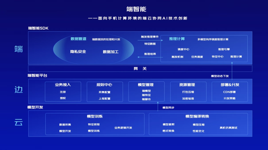 (4)云端协同的工程平台建设:通过建设端侧PythonVM能力,实现同一套代码逻辑云端共用。建设了模型预加载和模型后加载等多种端模型分发和部署能力,支持云端模型训练共用一套训练引擎能力。