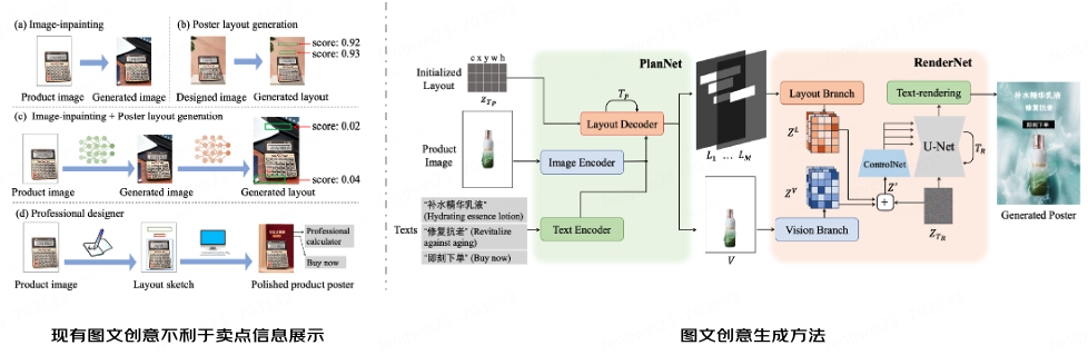 图片创意上,技术团队提出通过类别生成器实现大规模背景生成,并使用个性化生成器从参考图像学习个性化风格,在保持个性化风格的同时能够生成高质量的不同类别背景;文案创意上,基于大语言模型通识,结合商详OCR卖点挖掘、标题、属性亮点词等电商数据,通过模型fine-tune、外挂知识库等方式,实现了满足用户偏好的营销文案创意生成;图文创意上,提出了一种P&R框架并分为规划和渲染两个阶段,规划阶段考虑产品外观和文本语义特征,使用PlanNet生成多样化、合理的布局,渲染阶段虑生成的布局和融合不同组件的空间关系,使用RenderNet生成背景。