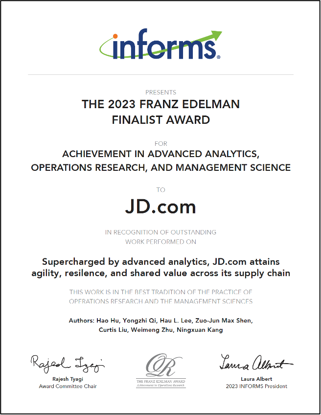 京东长期致力于通过前沿的数智化技术和算法,提高供应链效率。2023年,智能供应链团队提出并应用了端到端库存管理技术和可解释AI技术,显著提升了补货决策的精准度,实现更快的库存周转和更高效的供应链决策、协同。前者入围2023年管理科学界最高奖项弗兰兹厄德曼奖决赛,后者入围2024年Gartner Power of the Profession供应链流程与技术创新奖决赛,也是该奖项唯一亚洲入围者。