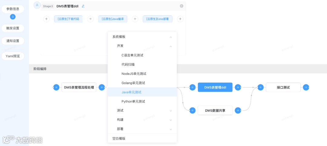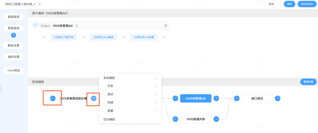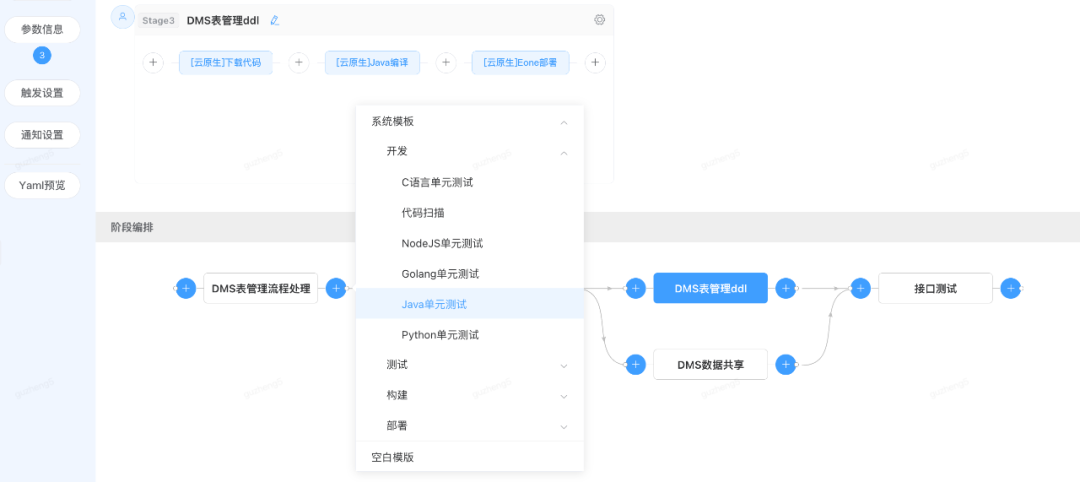 图形化的“阶段编排”快速搭建流程,在每个stage的前后分别会有一个“➕”号,此加号作用是建立前后依赖关系。当点击左侧加号时,添加前置依赖阶段;点击右侧加号时,添加依赖于当前阶段的后续阶段。在点击完成的同时,弹出stage模版(分阶段选择)添加创建。