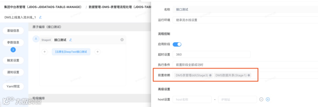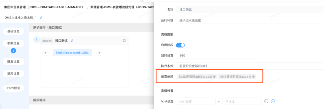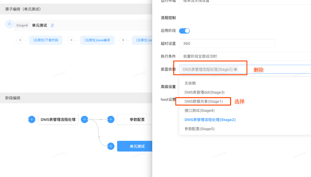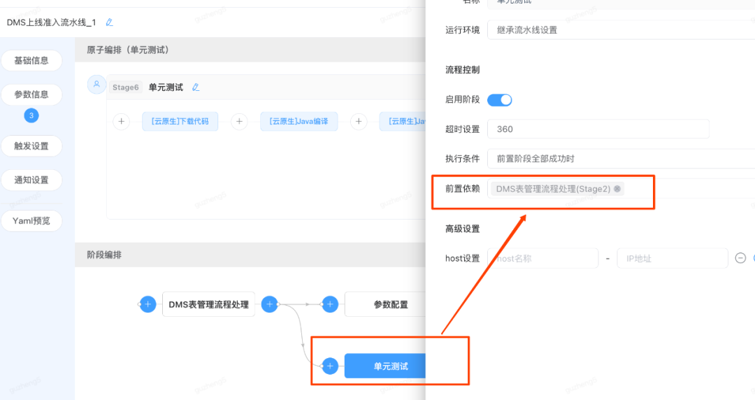 查看单元测试阶段的依赖设置,前置依赖-“DMS表管理流程处理”