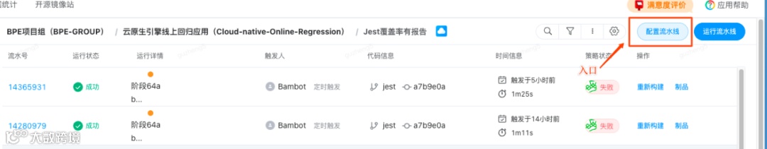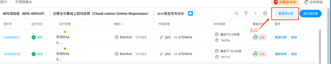 入口:流水线列表或流水线构建记录页,点击“配置流水线”