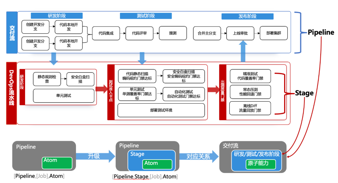 从模型设计看:从原来的两层结构,升级为三层结构。增加阶段级(stage)概念,增加阶段级模型是为了解决与交付流程中各阶段(研发阶段,测试阶段,上线阶段)的对应关系。在研发阶段可以支持多需求的并行开发模式;在测试阶段支持对应测试环境的部署,自动化测试组合的复杂场景;在上线阶段,支持多应用的并行上线发布,有依赖关系的发布流程,支持常见发布策略(金丝雀/蓝绿)等。