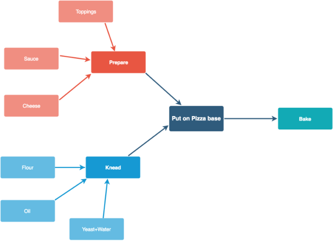 这里我们以“制作Pizza”的流程为例,简单的把操作拆分为4个阶段:准备食材Prepare(如鸡肉,起司,青椒等),揉面Knead(面粉,油,发酵),制作(组合准备的食材与披萨底座),最终烘焙完成。在整个流程中,前后阶段是隐含着依赖关系,并驱动每一个阶段继续执行下去。