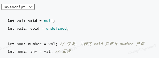 空值 void 表示不返回任何值,一般用于函数定义返回类型时使用,用 void 关键字表示没有任何返回值的函数,void 类型的变量只能赋值为 null 和 undefined,不能赋值给其他类型上(除了 any 类型以外); -