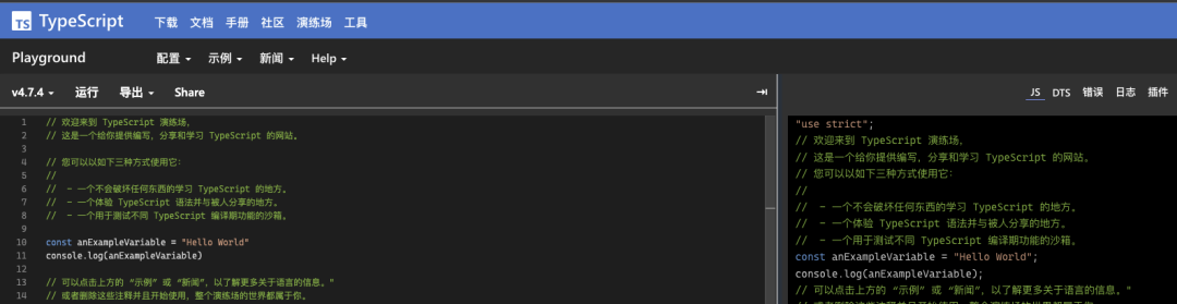 支持 TypeScript 大部分配置项和编译选项,可以模拟本地环境,查看代码片段的输出结果;