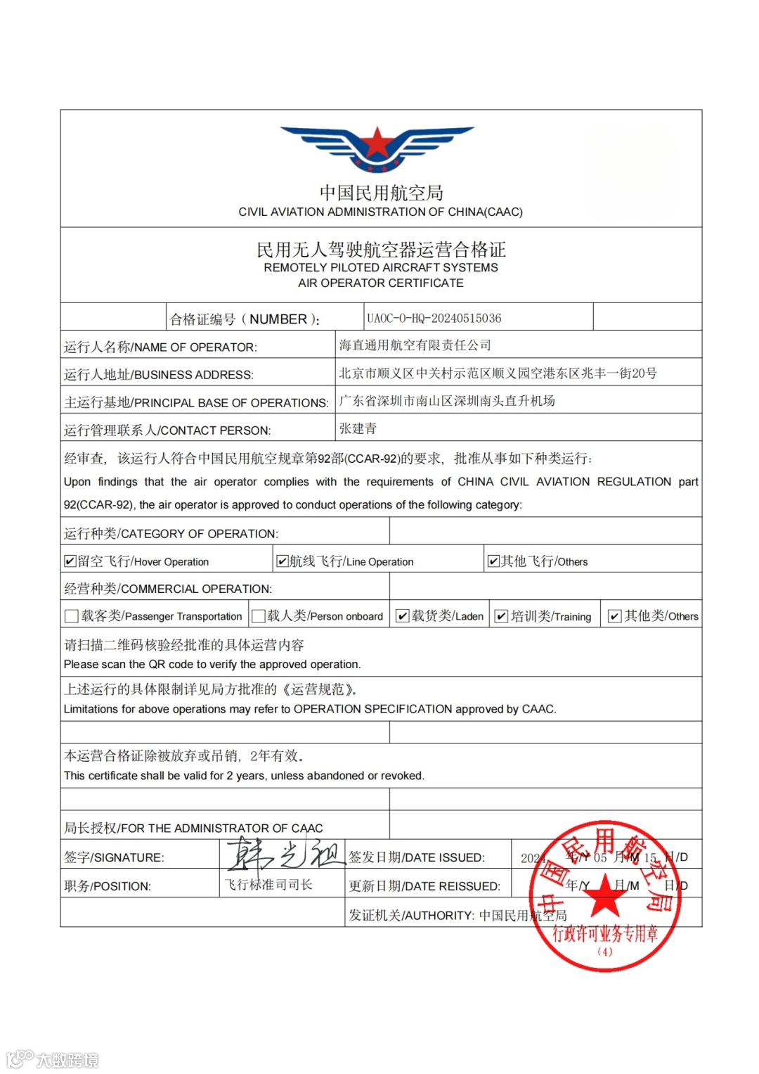 2024年6月6日,海直通用航空有限责任公司(简称“海直通航”,中国中信集团旗下中信海洋直升机股份有限公司直属控股子公司)成功中标2024年中国邮政速递物流股份有限公司无人机设备机型、培训资源池采购项目(包1:无人机设备机型资源池),成为中国邮政无人机物流配送指定供应商,为邮政企业及相关单位提供无人机设备飞行保障等服务,执行不同应用场景的飞行任务。