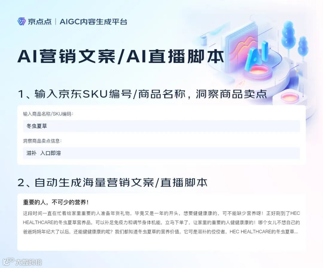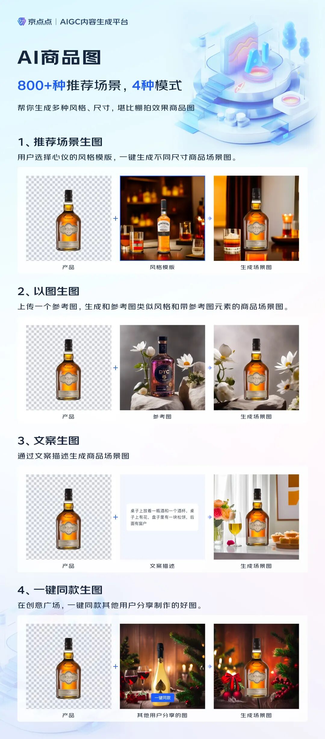 AIGC内容生成平台是京东出品的一款基于AI大模型的生成式内容生产工具,它可以帮助用户快速、高效地生成堪比棚拍质感的商品场景图和堪比专业写手的营销文案,让摄影小白1分钟制作百张商品图,百篇营销文案。