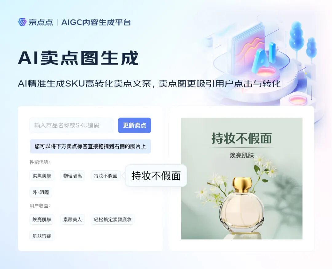 京点点AIGC内容生成平台是京东基于AIGC能力的内容创作平台,帮助京东商家用户提升内容生成效率和效果。平台上线多个实用功能,AI智能抠图、AI商品图、营销贴片、AI卖点图、AI营销文案/直播脚本。服务用户数30000+家各个品类商家用户,单日生成超60万张商品图片。