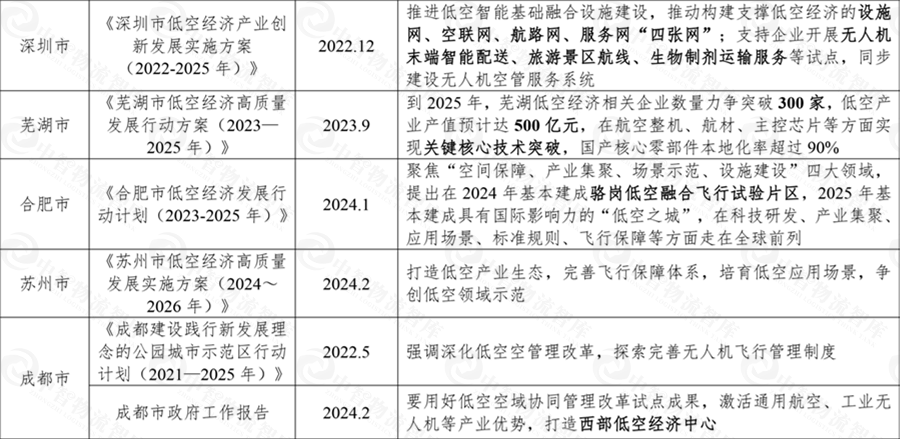作为创新前沿的热点产业,低空经济的发展得到了不少地方的支持鼓励,其中,如表2-2所示,以深圳、芜湖、成都为代表的城市,正在基于自身产业的基础、城市的定位加速前进。