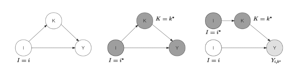 因果图是有向无环图,其中节点表示随机变量、有向边表示节点之间的因果作用方向。如上图对于节点Y变量,有两条路径的因果作用,分别是 I → Y 、I → K → Y。