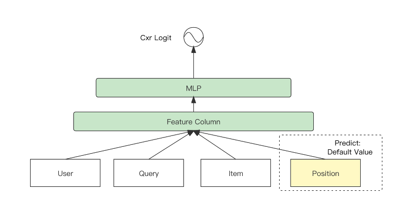训练阶段,pos作为模型特征使用,与其他u/q/i侧特征联合,共同输入模型网络,计算相应logits并梯度回传。预测推理阶段,所有样本强制采用同一个pos值,近乎理解为:同一个user/query下, 所有商品在同样的展示位置上,进行预测分数比较。