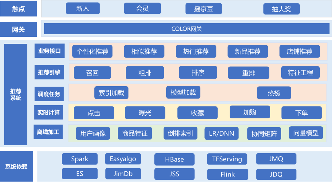 当一个用户打开一个页面,这个时候前端会携带用户信息(pin或者uuid等)去请求后台接口(通过color间接调用),当后台收到请求后一般会先根据用户标识进行分流获取相关策略配置(ab策略),这些策略去决定接下来会调用召回模块、排序模块以及重排模块的哪个接口。一般召回模块分多路召回,每路召回负责召回多个商品,排序和重排负责调整这些商品的顺序。最后挑选出合适的商品并进行价格、图片等相关信息补充展现给用户。用户会根据自己是否感兴趣选择点击或者不点击,这些涉及用户的行为会通过日志上报到数据平台,为之后效果分析和利用用户行为推荐商品奠定基础。