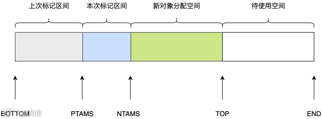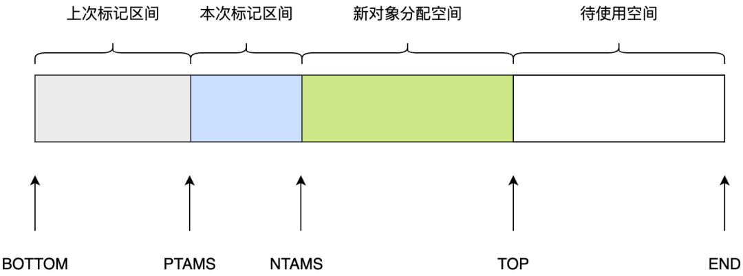 为了保证垃圾回收过程中的同时Region也能够被使用,G1为每一个Region设计了两个名为TAMS的指针,分别是Previous TAMS(PTAMS)、Next TAMS(NTAMS)。在并发标记阶段开始前,TAMS指针指向Region内占用内存的边界。在并发标记阶段中,G1默认指针之上的对象为存活对象不去进行标记,而对象分配时,用户线程直接在指针之上分配。这就保证了扫描行为和对象分配互不干扰。