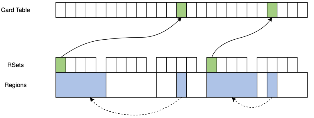 G1堆中的每一个Region都有一份Rememberd Set,也叫RSet,它的作用就是为每一个Region记录哪些Region对其含有引用。