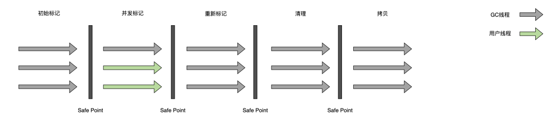 标记GC Roots直接关联的对象,并修改TAMS指针的值。值得注意的是,这一阶段并不单独执行,而是在Minor GC时同步完成。所以实际上这个阶段没有额外停顿。