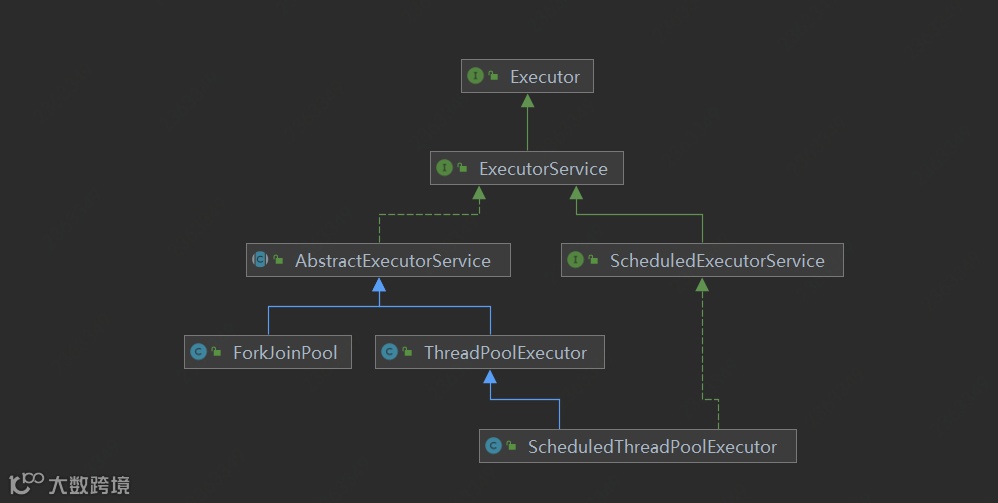 常见创建线程池方式如:通过 JDK 提供的 ThreadPoolExecutor、ScheduledThreadPoolExecutor 以及 JDK 7 开始引入的 ForkJoinPool 创建,还有更方便的 Executors 类以及 spring 提供的 ThreadPoolTaskExecutor 等。其关系如下图:
