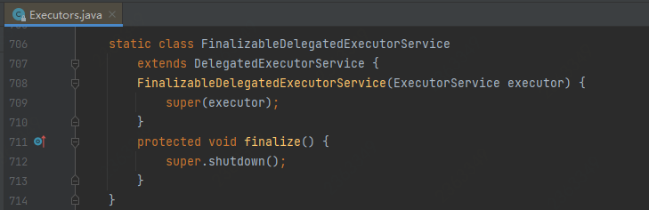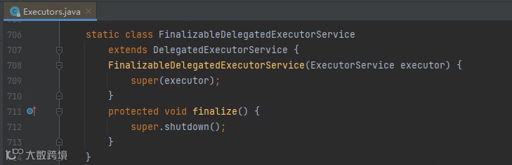 3)SingleThreadExecutor:在创建时实际返回的是 FinalizableDelegatedExecutorService 类的对象,该类重新了 finalize() 函数执行线程池的销毁,该对象持有 ThreadPoolExecutor 对象的引用,但 ThreadPoolExecutor 对象并不引用 FinalizableDelegatedExecutorService 对象,这使得在 FinalizableDelegatedExecutorService 对象的外部引用消失后,GC 将会对其进行回收,触发 finalize 函数,而该函数仅仅简单的调用 shutdown 函数关闭线程,在所有当前的任务执行完成后,回收线程池中线程,则 GC 可回收线程池对象。