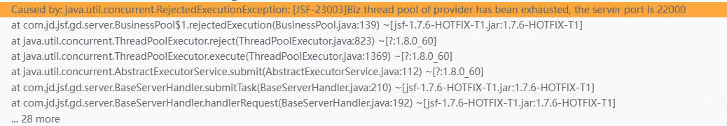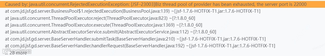相信大多数京东开发者都遇到过,JSF 依赖服务触发拒绝策略的现象,即抛出线程拒绝异常。这是当 Provider的 业务线程池满了,无可用线程池的时候,会返回一个异常给 Consumer,告知 Consumer 该 Provider 线程池已耗尽。如图: