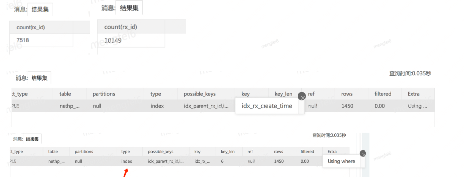 没加新索引rx_create_time的时候,由于order by后边没有索引,就看where条件中是否有合适的索引,查询选择器选定rx_status这个单列索引,而rx_status=5这个条件下限制的数据行在索引中是连续,即使需要的rx_id不在索引中,再回主键聚簇索引也来得及,由于order by后边没有索引,所以走磁盘级别的排序filesort,高峰积压的时候处方就1万到2万,跑到了100ms,白天低谷的时候几百单也就20ms。 -