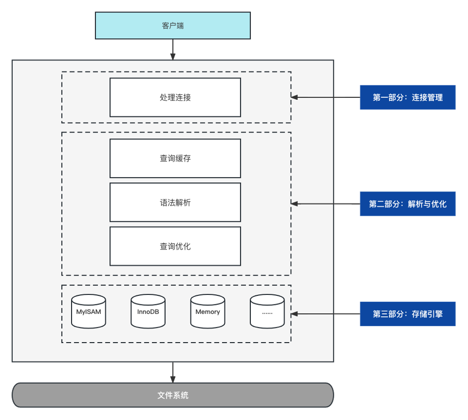 我们重点关注第二部分和第三部分,第二部分其实就是Server层,这层主要就是负责查询优化,制定出一些执行计划,然后调用存储引擎给我们提供的各种底层基础API,最终将数据返回给客户端。