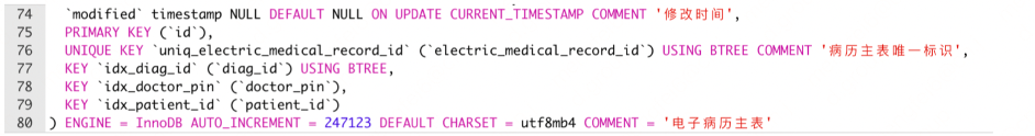 PRIMARY KEY (`id`),UNIQUE KEY `uniq_rx_id` (`rx_id`),KEY `idx_diag_id` (`diag_id`),KEY `idx_doctor_pin` (`doctor_pin`) USING BTREE,KEY `idx_rx_storeId` (`store_id`),KEY `idx_parent_rx_id` (`parent_rx_id`) USING BTREE,KEY `idx_rx_status` (`rx_status`) USING BTREE,KEY `idx_doctor_status_type` (`doctor_pin`, `rx_status`, `rx_type`),KEY `idx_business_store` (`business_type`, `store_id`),KEY `idx_doctor_pin_patientid` (`patient_id`, `doctor_pin`) USING BTREE,KEY `idx_rx_create_time` (`rx_create_time`)