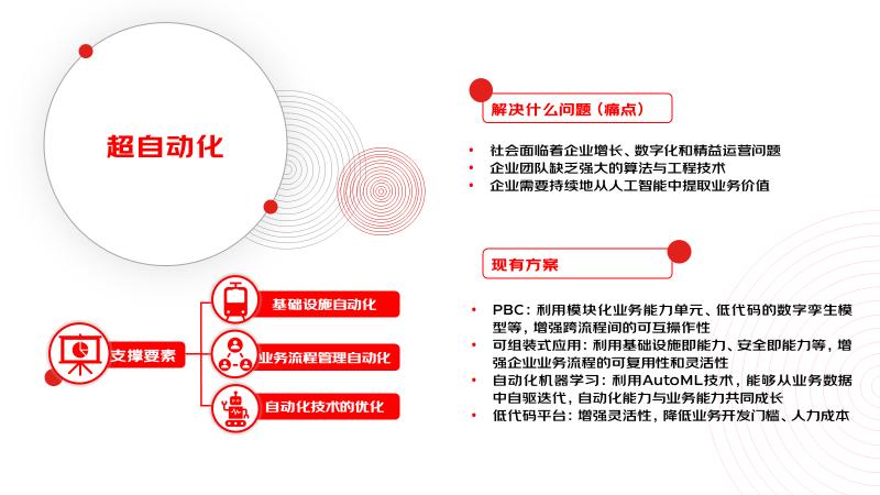 超自动化是一种业务驱动的方法,用于识别、审查和自动化尽可能多的业务流程、IT流程和算法流程等。它需要协调使用多种技术工具和平台,包括机器人流程自动化(RPA)、自动机器学习 (AutoML) 、人工智能工程化 (AI Engineering)、低代码平台等。